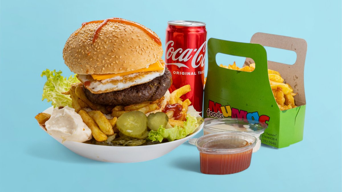 бургер по избо с яйце и кашкавал, порция пържени картофки с кетчуп и майонеза
