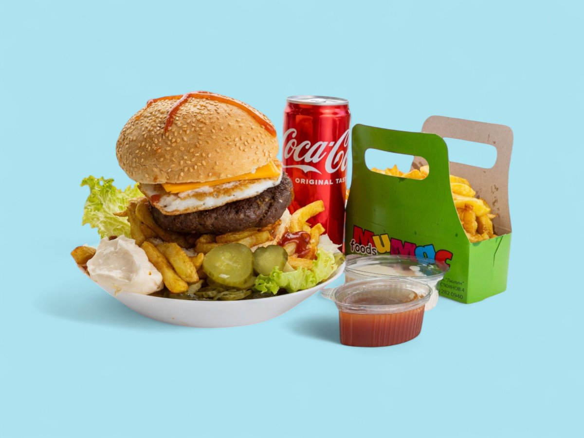 телешко кюфте х2, картофи, кетчуп, майонеза, зеле, кисели краставички, яйце, кашкавал 400г