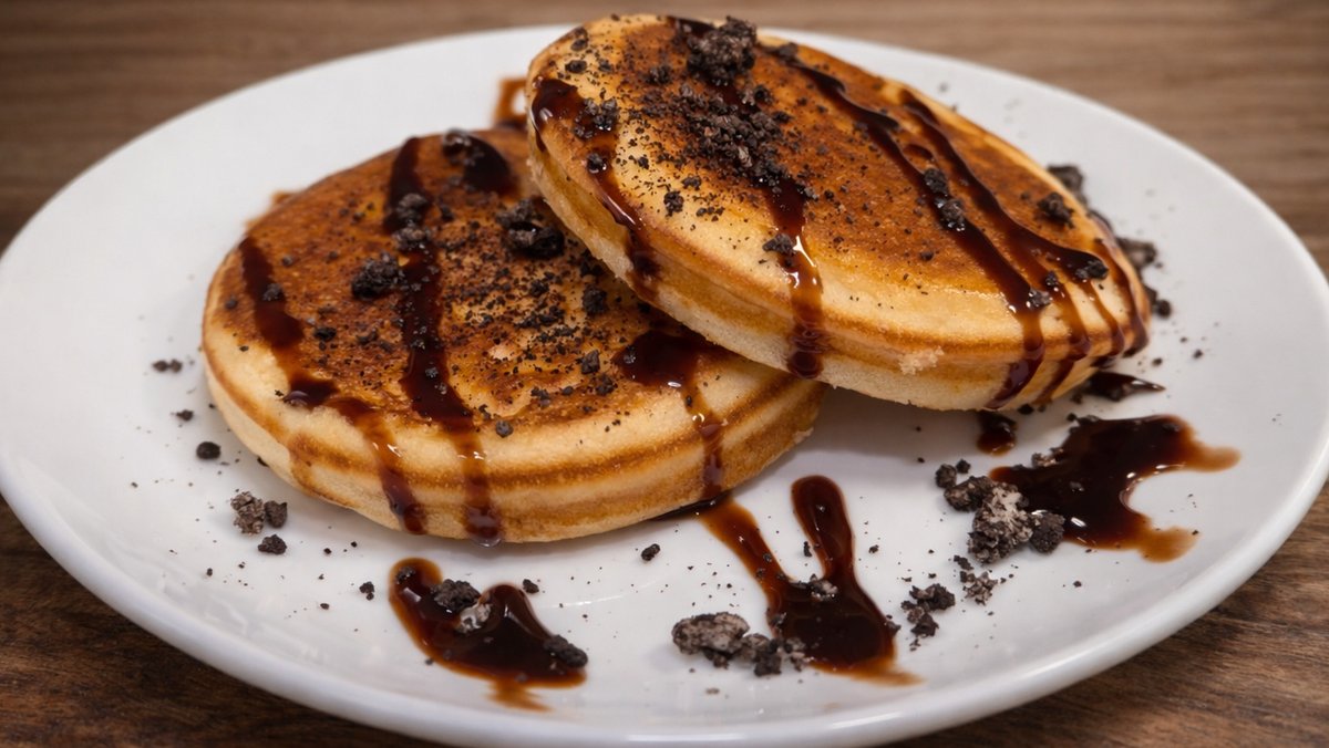 Aмерикански палачинки заляти с шоколадов топинг и натрошени бисквити Орео.
