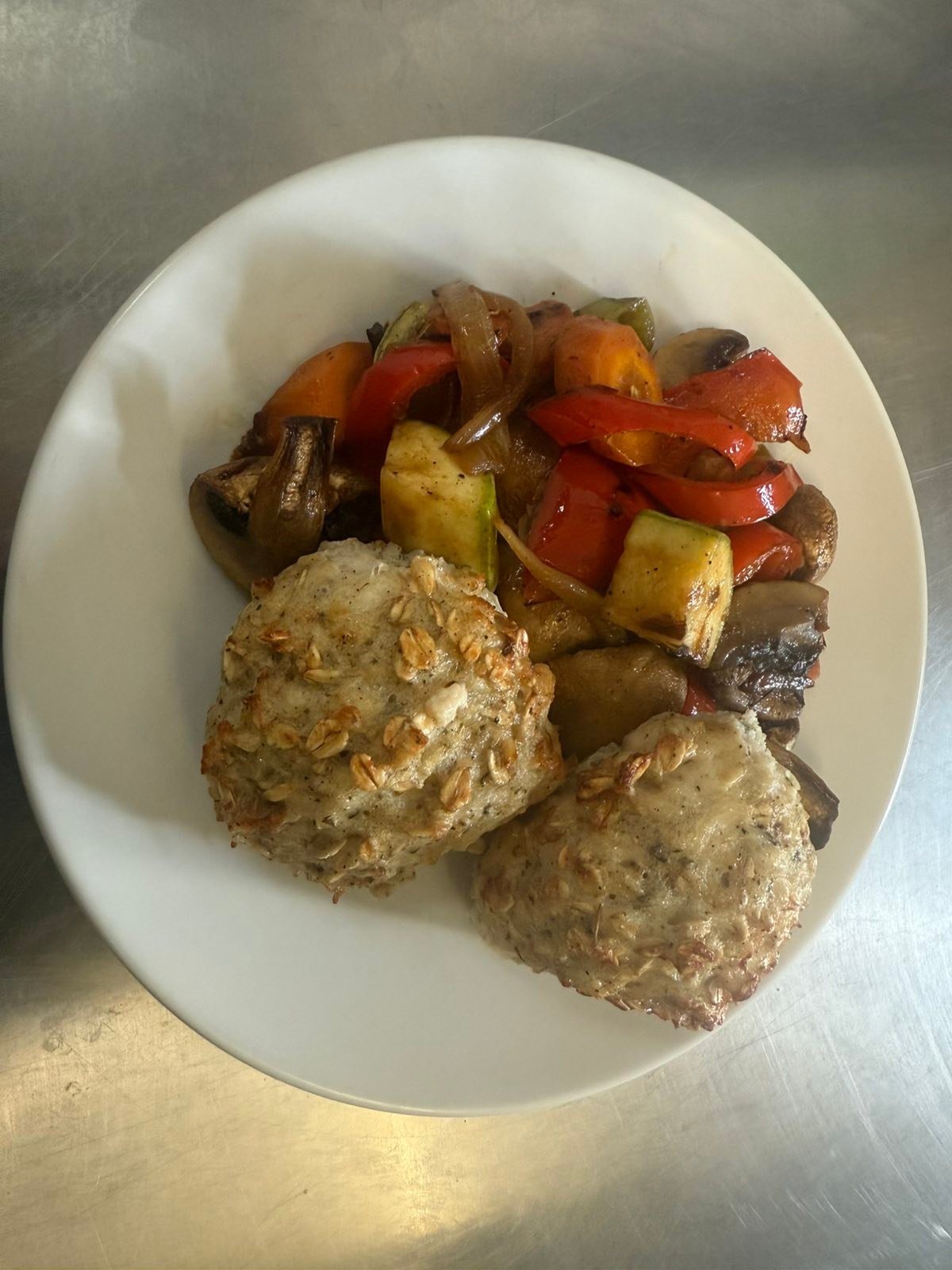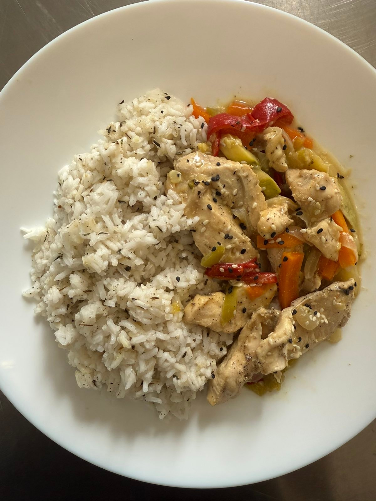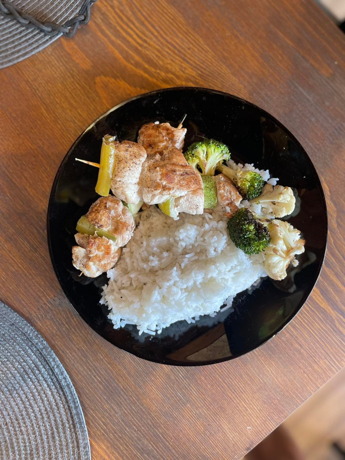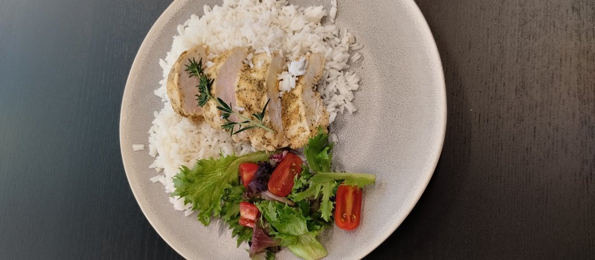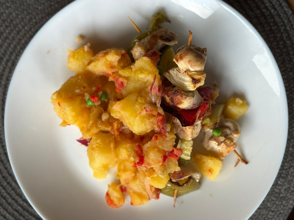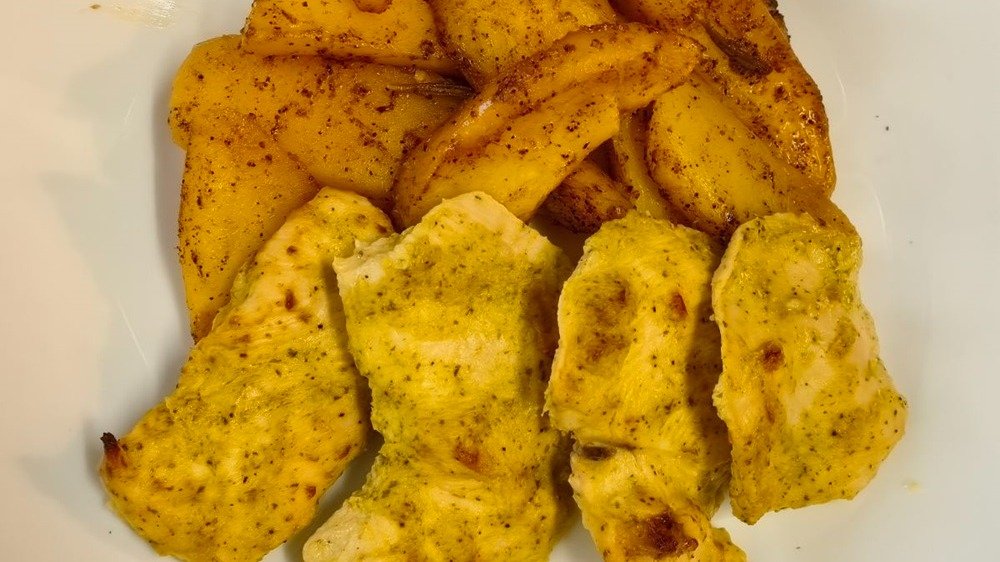 Мариновано пиле със запечени уеджис картофи и билков сос