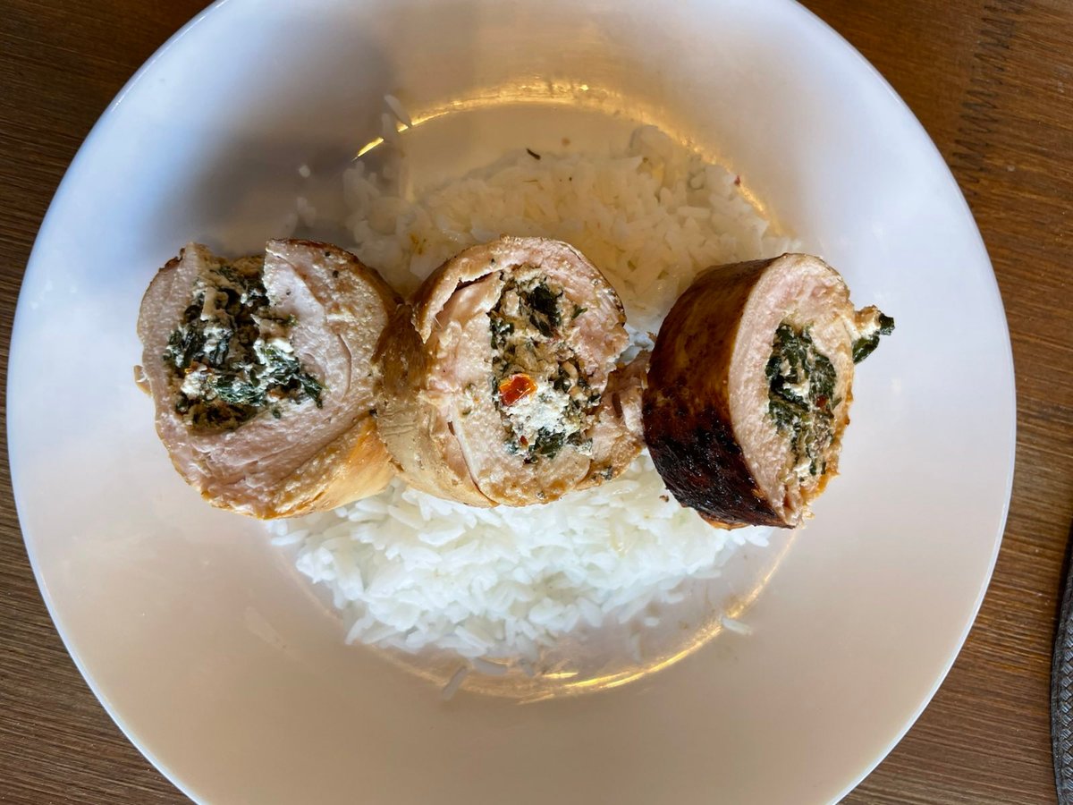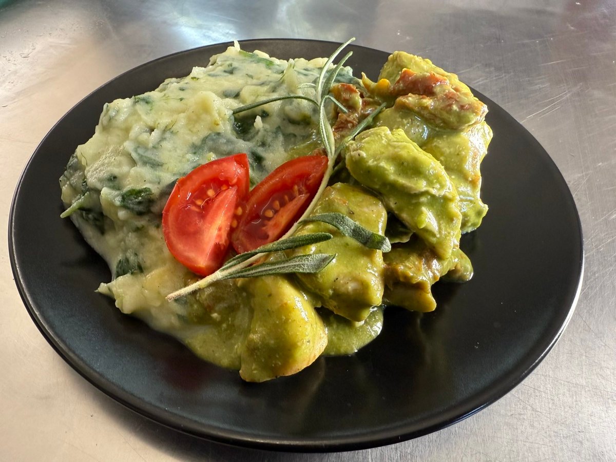 Пиле с песто и сушени домати с г-ра картофи и спанак