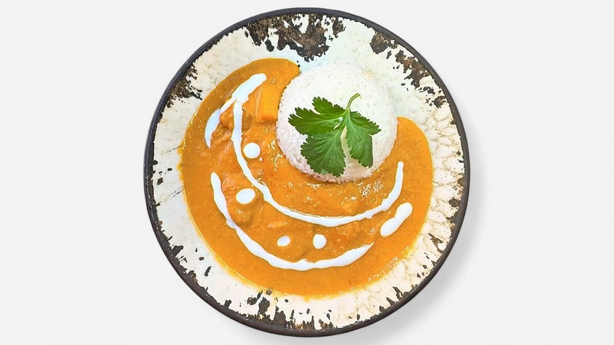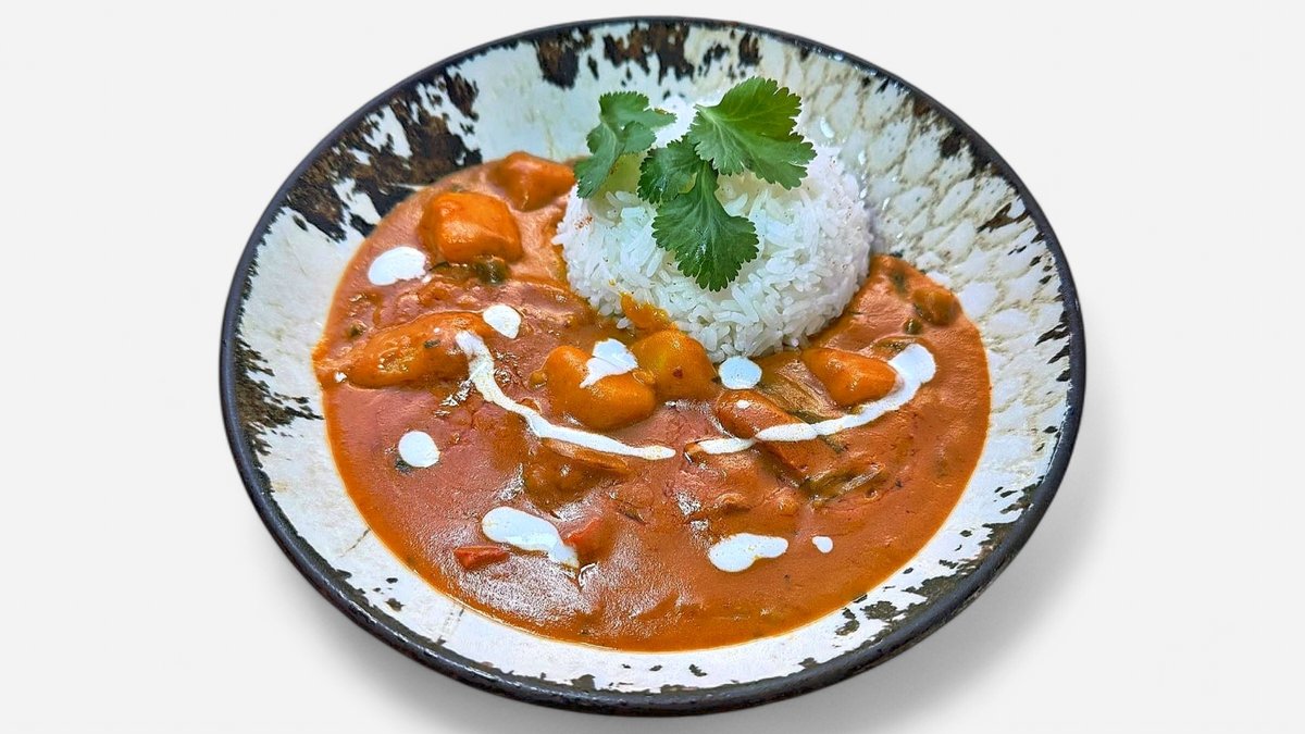 Крехко пилешко филе в кадифен доматено-маслен сос с кашу и индийски подправки върху канапе от басмати ориз.