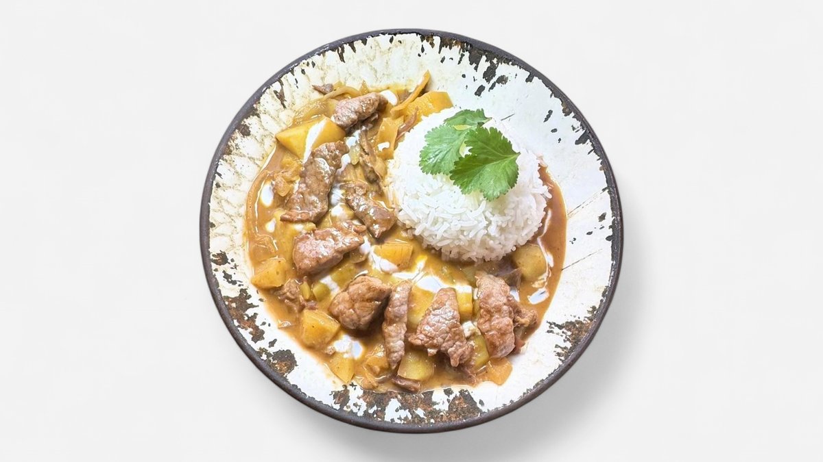 крехко телешко месо в плътно тайландско масаман къри с кокосово мляко, картофи, ананас и ароматни подправки . Сервирано върху канапе от басмати ориз