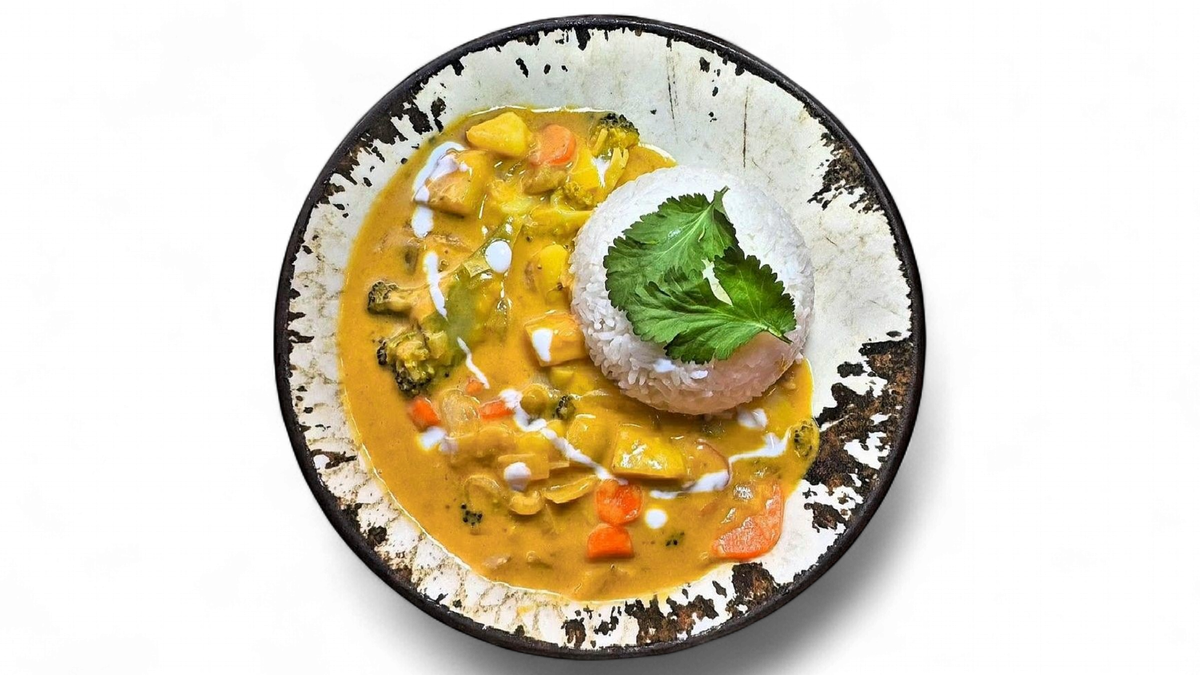 Кремообразно жълто тайландско къри с кокосово мляко, картофи манго и свежи зеленчуци- броколи, морков и червен лук.