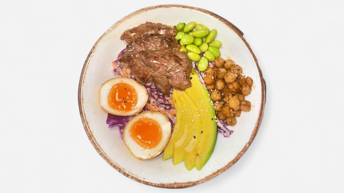 Зареждащ, високо-протеинов пауър бол, поднесен върху канапе от киноа, колсло с домашна японска майонеза, гарниран с едамаме, мариновано яйце, маринован нахут, авокадо и японска гъба Арикулария. Изберете от нашите апетитни, мариновани протеини.