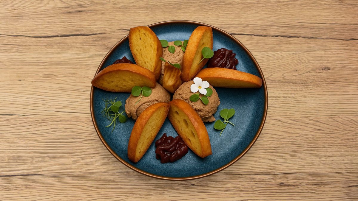 Домашен пилешки пастет с конфитюр от червен лук, поднесен с кростини