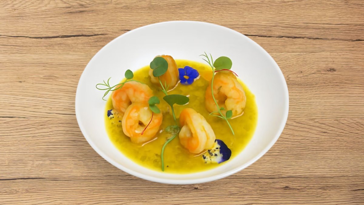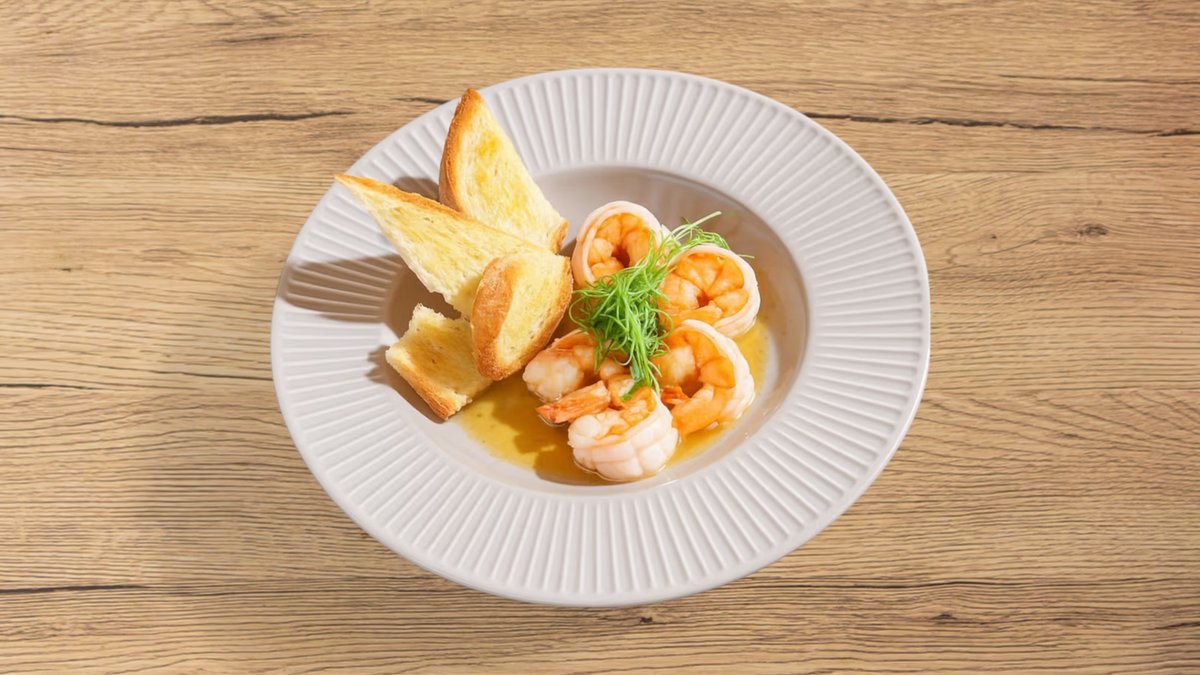 Скариди в маслен сос и перно Рикар, поднесени с кростини