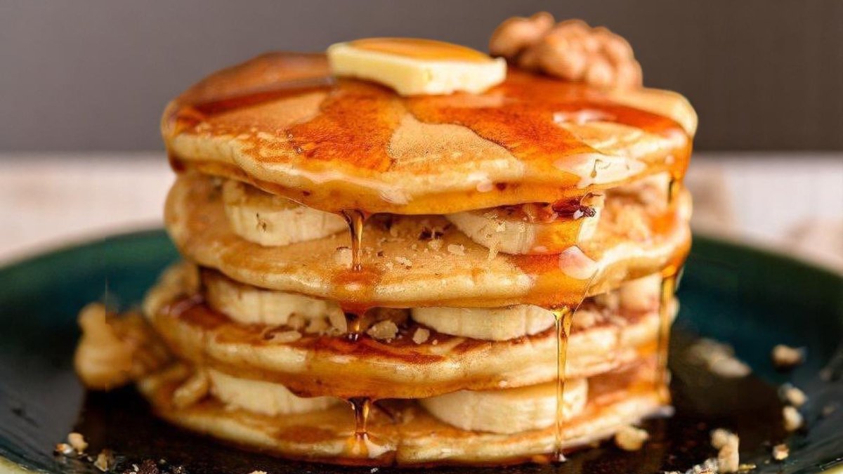 4 броя сладки американски палачинки, напоени с кленов сироп, аранжирани с резенчета банан и смлени орехи 240г