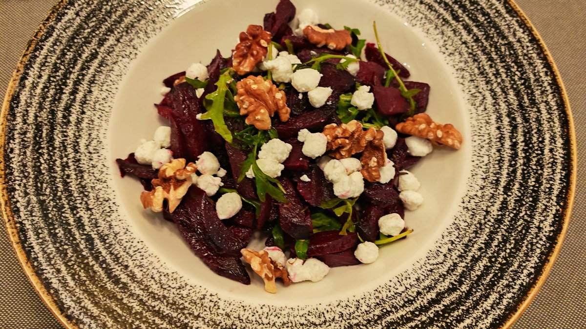 Печено червено цвекло с билки, рукола, орехи и перли от козе сирене