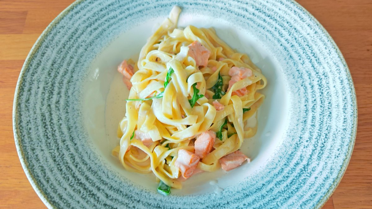 скариди, миди ядка, калмари, чери домати, чесън, бяло вино, доматен сос, пармезан 450г