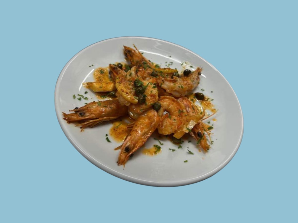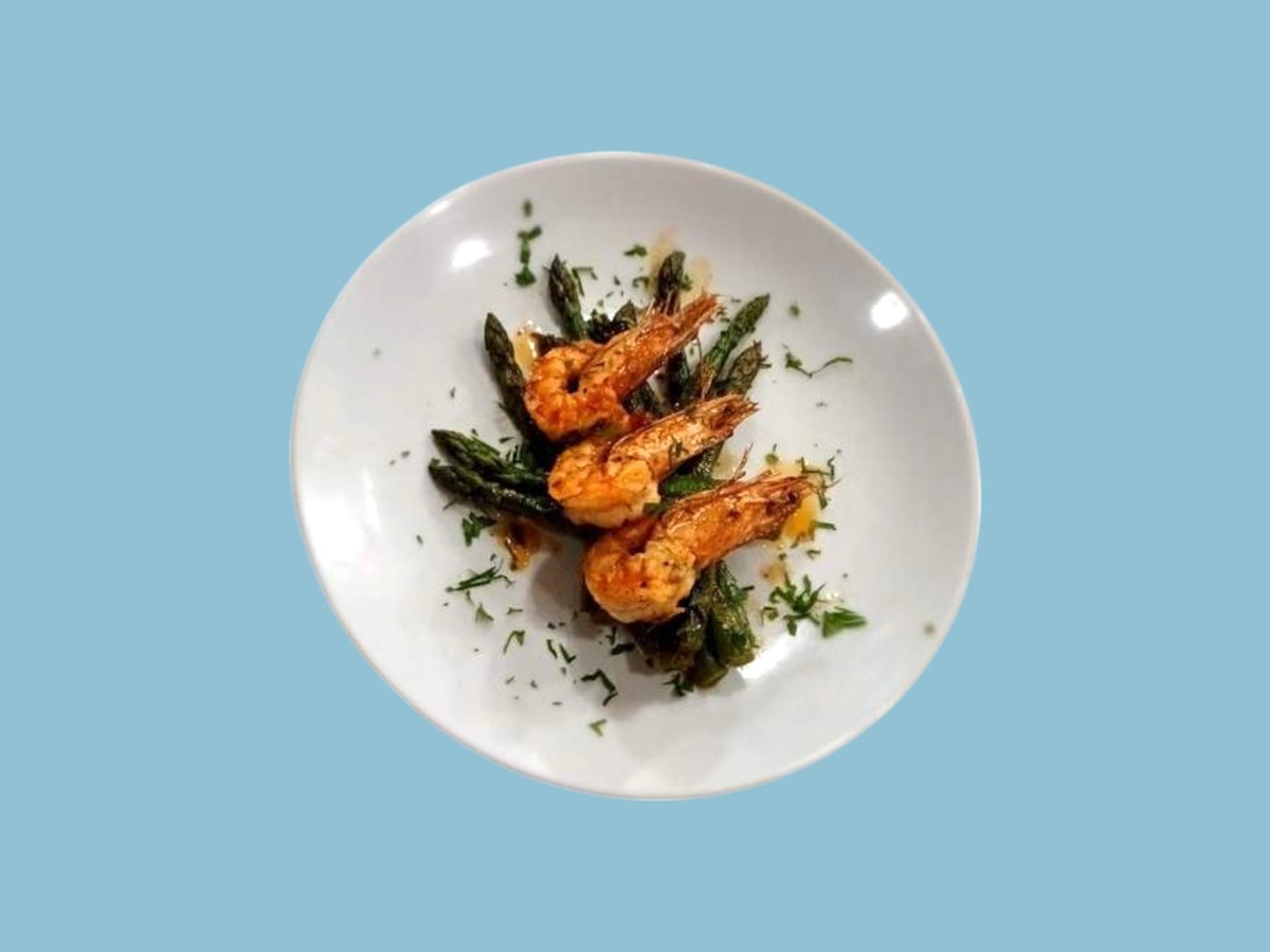 3 броя кралски скариди, аспержи, лимон, чесън, мащерка, магданоз, люспи сладък червен пипер, 300г