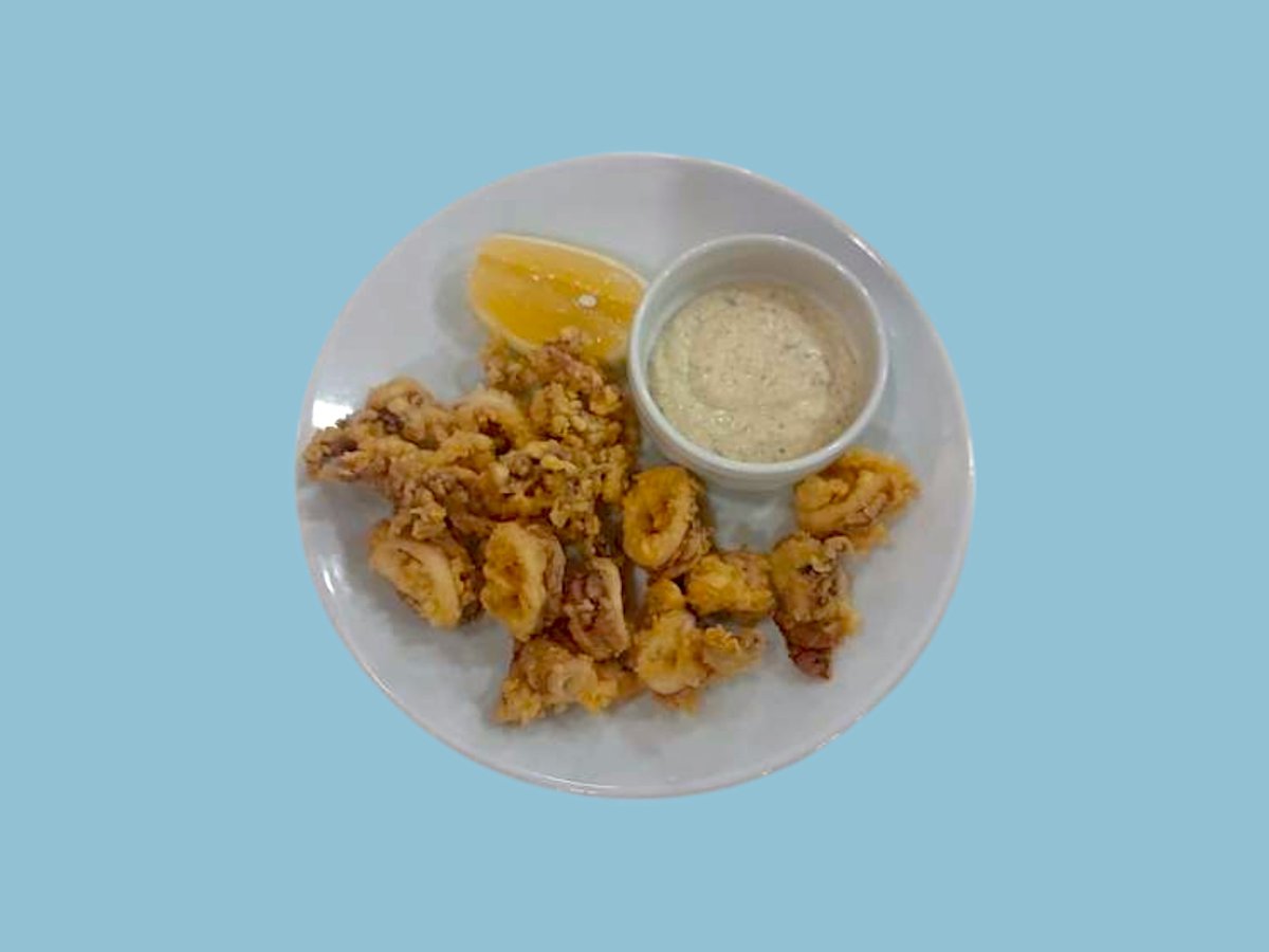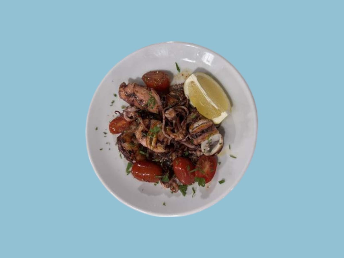 калмари, чили трошено, магданоз, чесън, лимон, Грана Падано, 200г