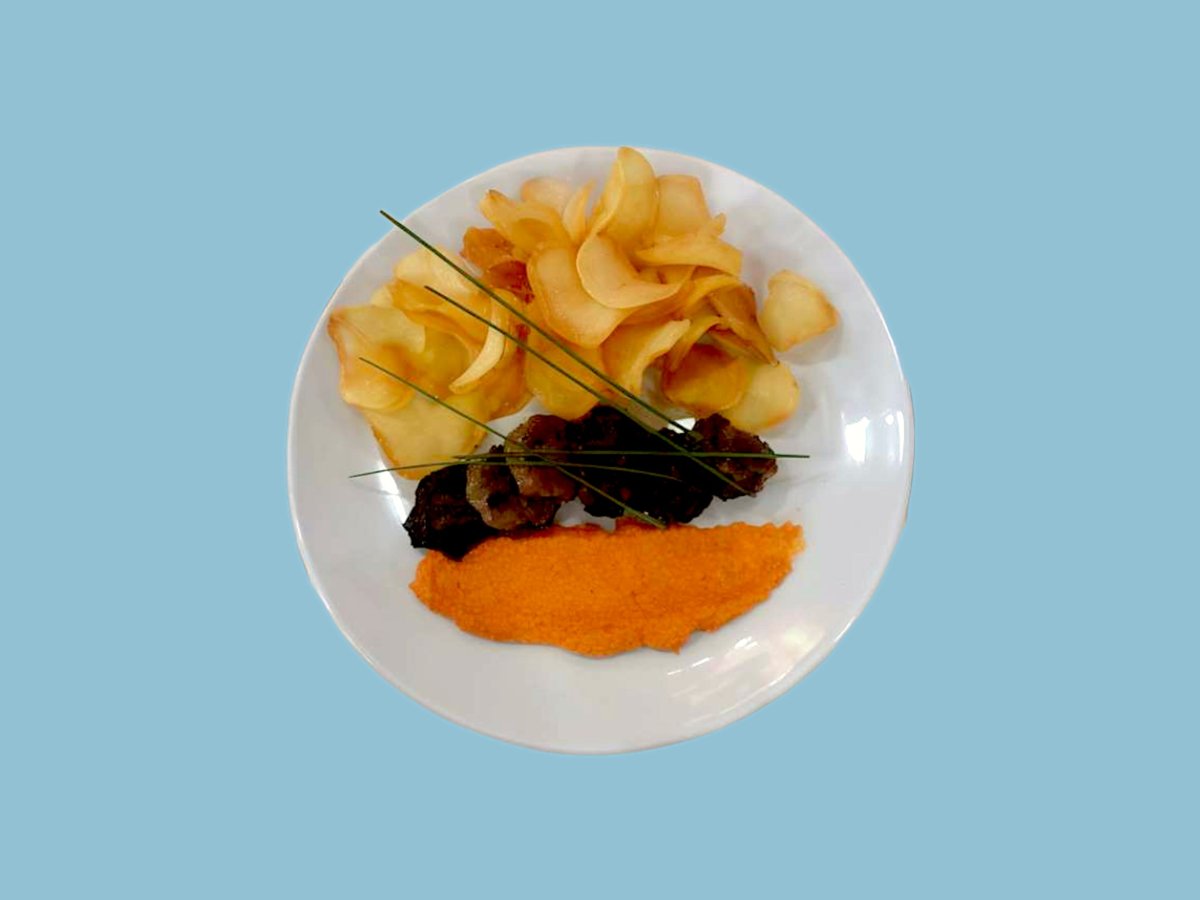 Телешки кюфтенца "Блек Ангъс" със сос "Ромеско" и домашен чипс от картофи