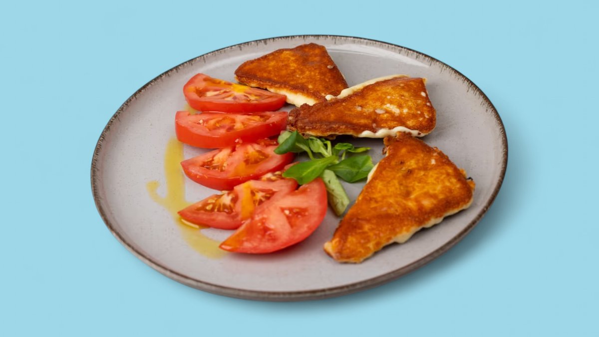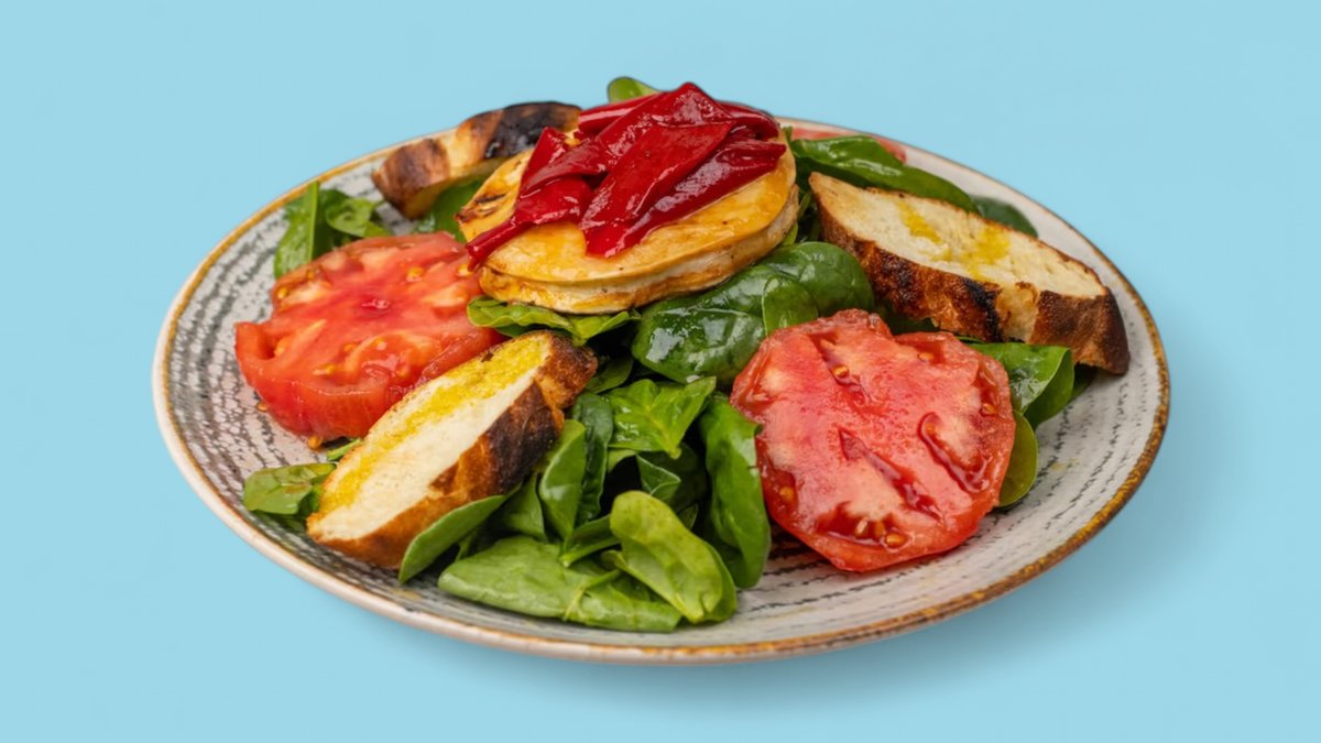 белени домати, пресен спанак, запечено козе сирене, сотирани печени червени чушки, кростини и сос Винегрет, 370г