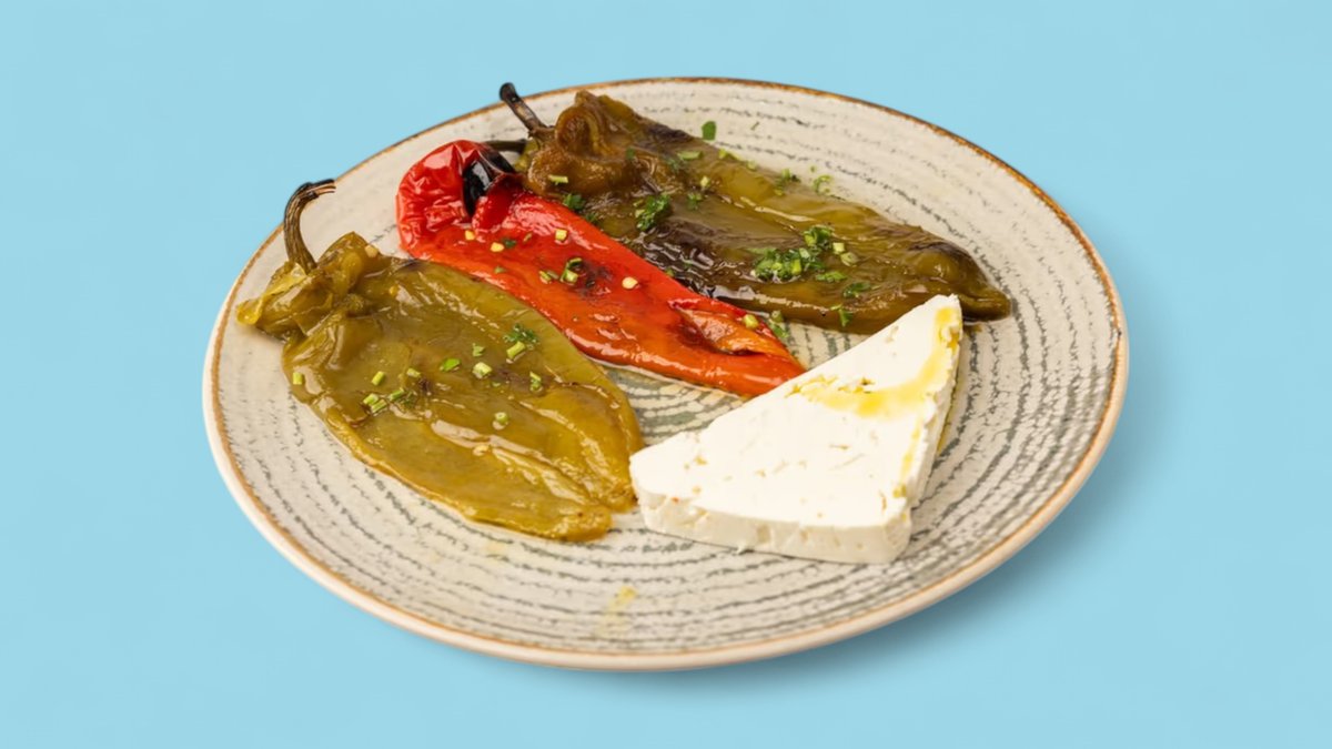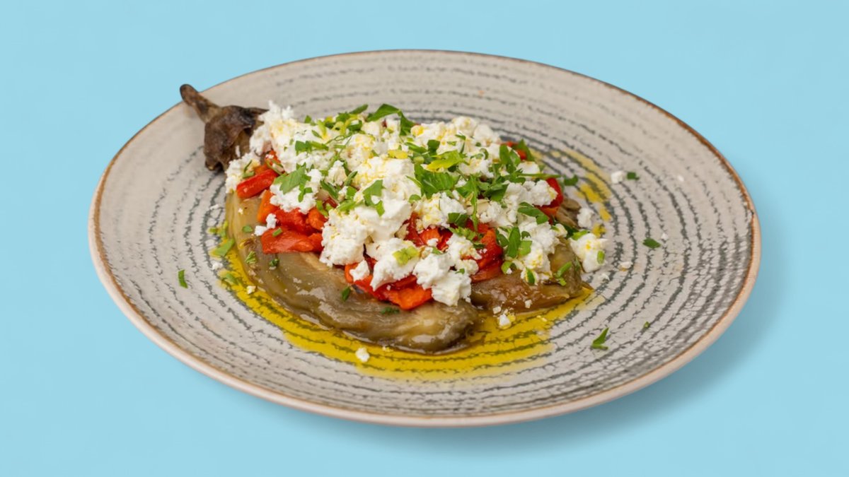 печен патладжан, печена чушка, сирене, зехтин, чесън и магданоз, 350г