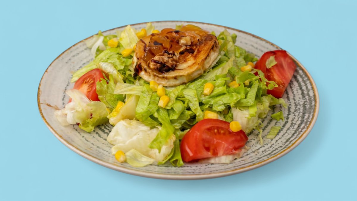 микс от марули, запечено козе сирене, домат, орехи, царевица, дресинг и сладко от ябълки, 350г