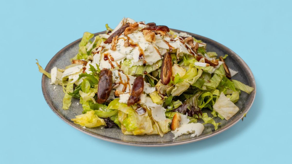 микс салати, печени орехи, фурми, синьо сирене и меден дресинг, 250г