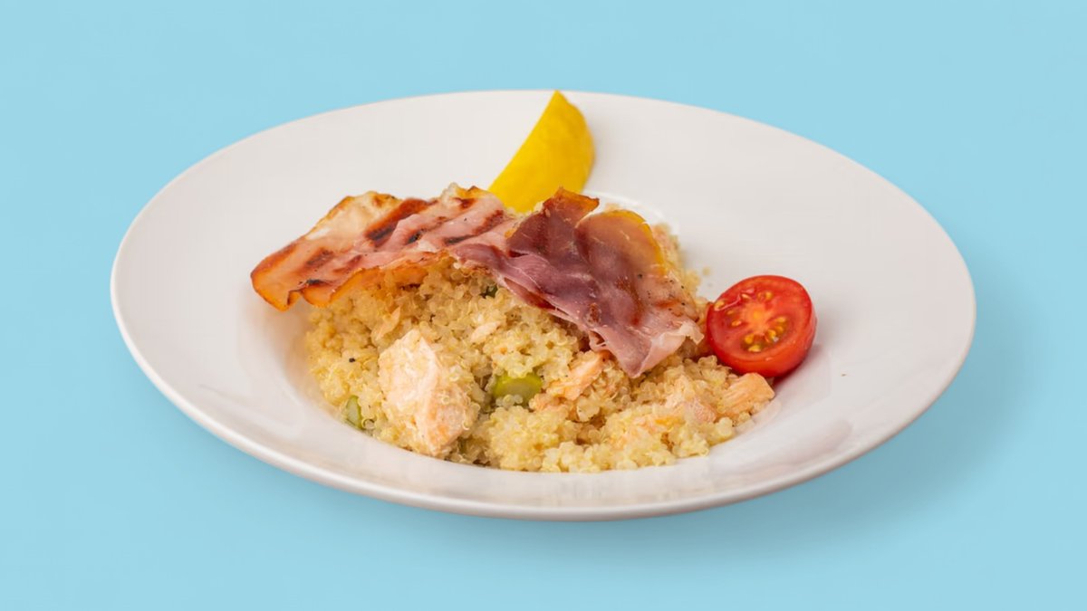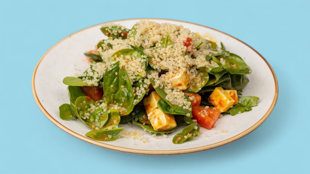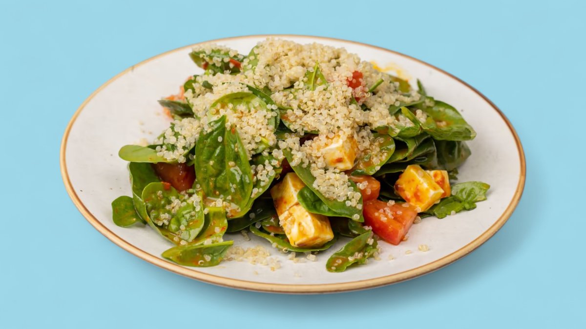 пресен спанак, Киноа, бяло сирене, домат, дресинг от Годжи Бери, зехтин, мед, лимон и ленено семе, 350г