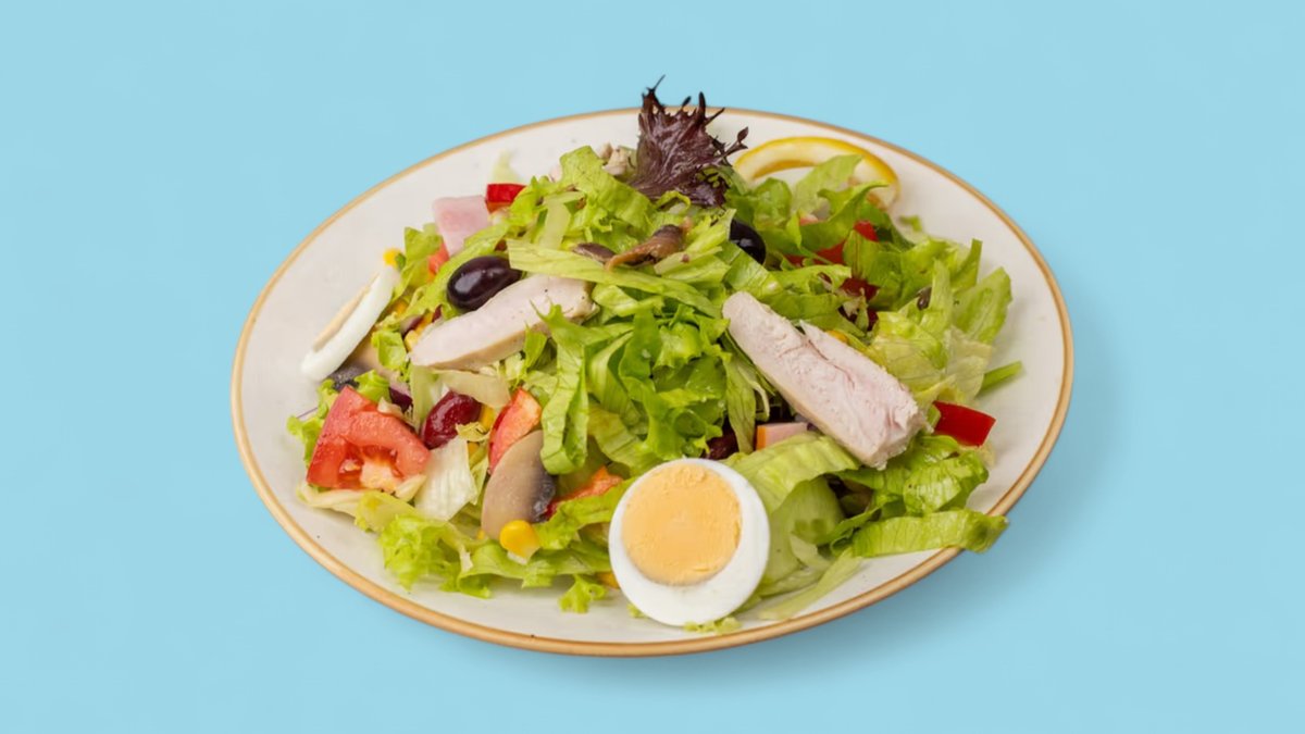 марули, домати, краставици, лук, чушки, боб, царевица, шунка, гъби, кашкавал, пилешки шишчета, аншоа, яйце, маслини