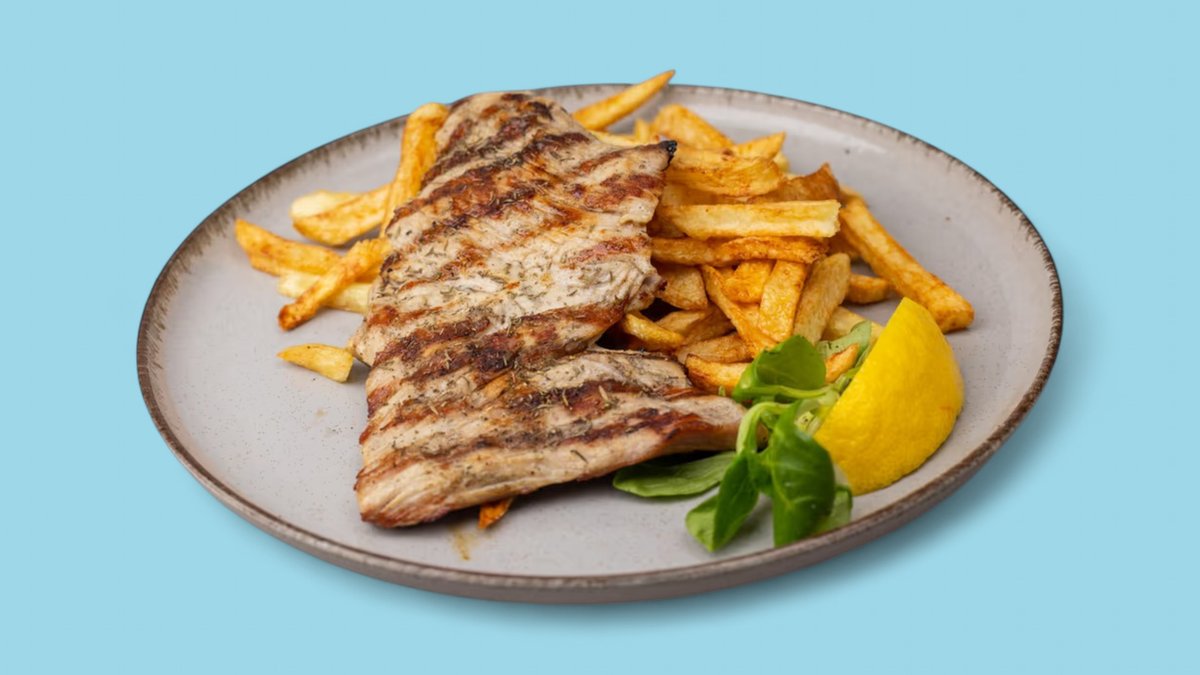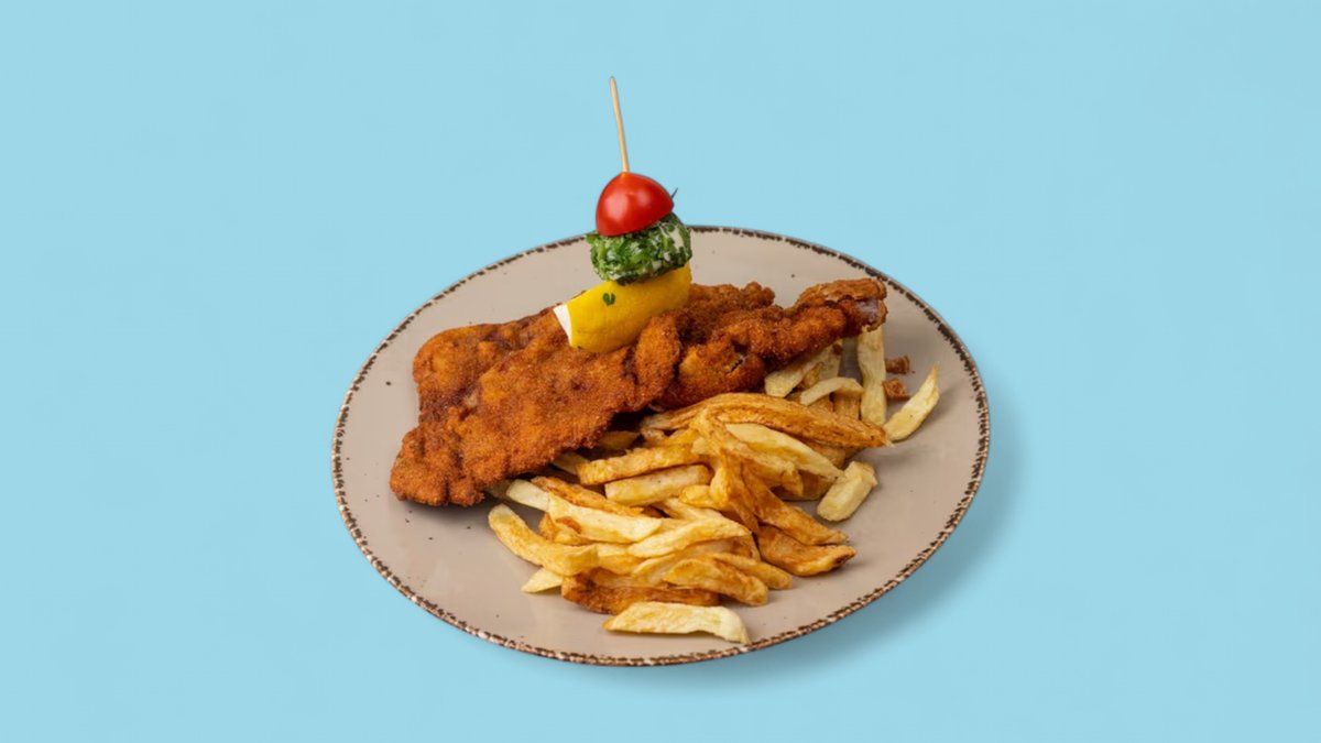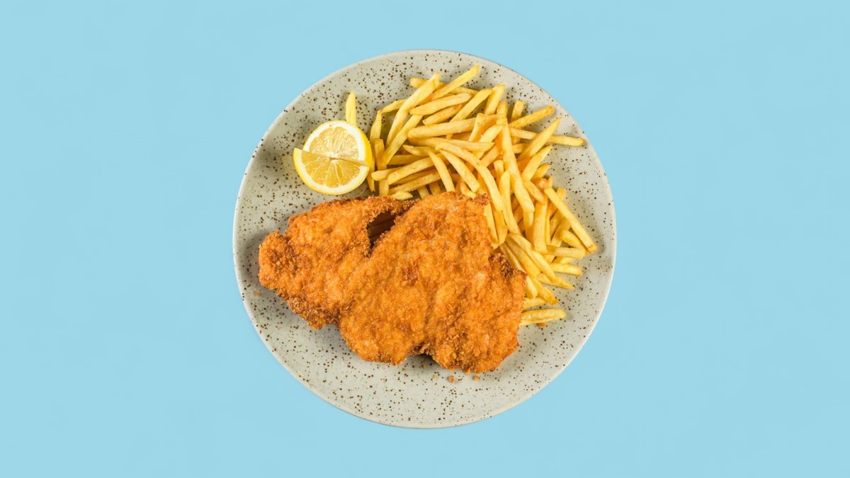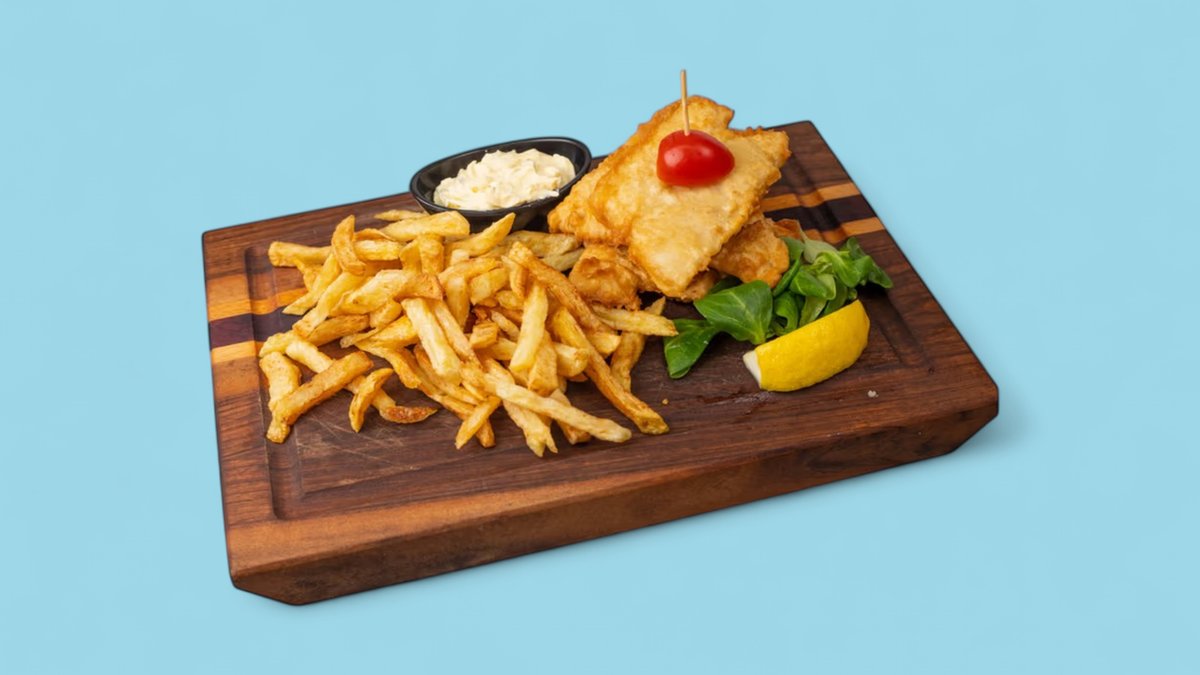 панирано филе от бяла риба с пържени картофки и сос тартар, 380г