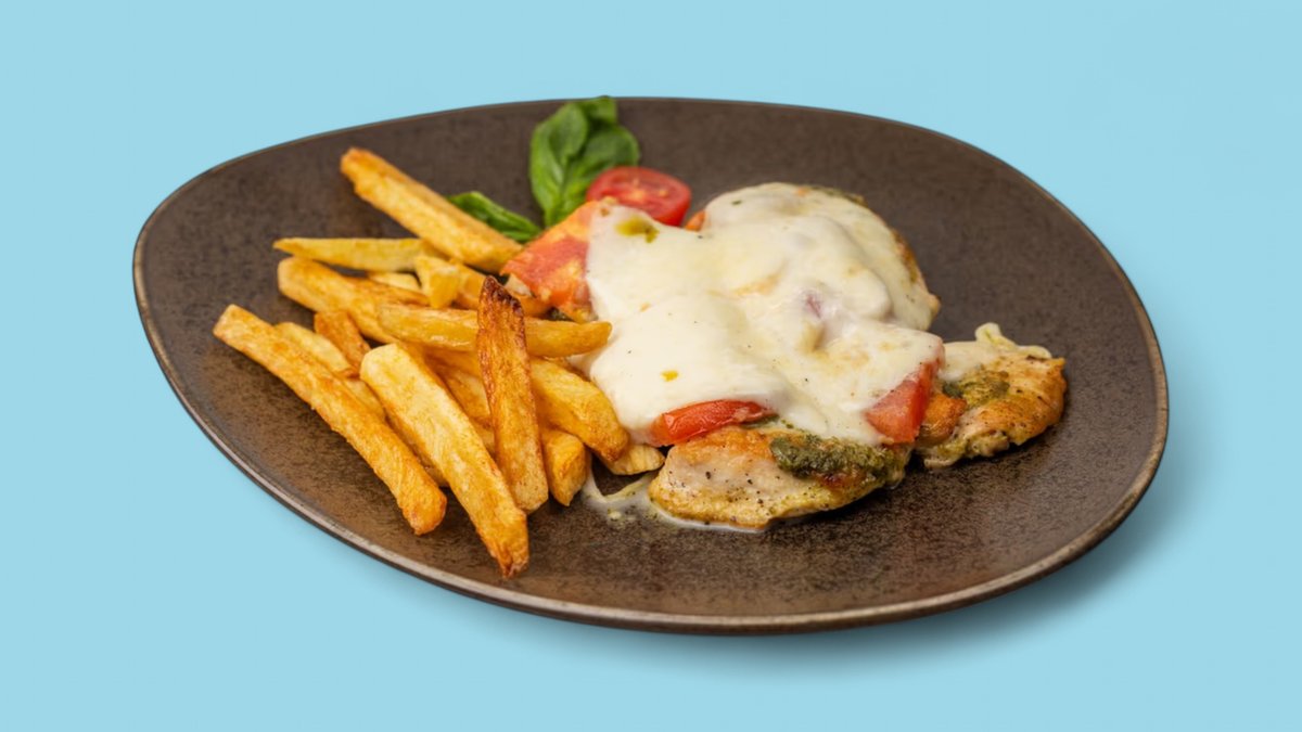 запечено пилешко филе с песто, моцарела, домат и гарнитура пържени картофи - 350г