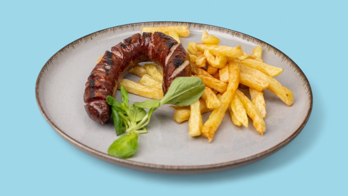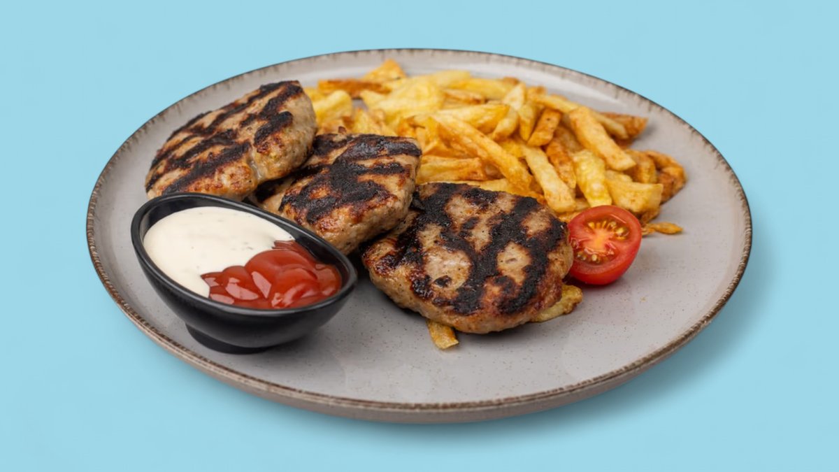 3 броя - сервирани с пържени картофи и два соса, 400г