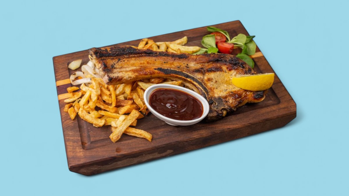 свински котлет, сервиран с грилован лук, пържени картофки и барбекю сос, 500г
