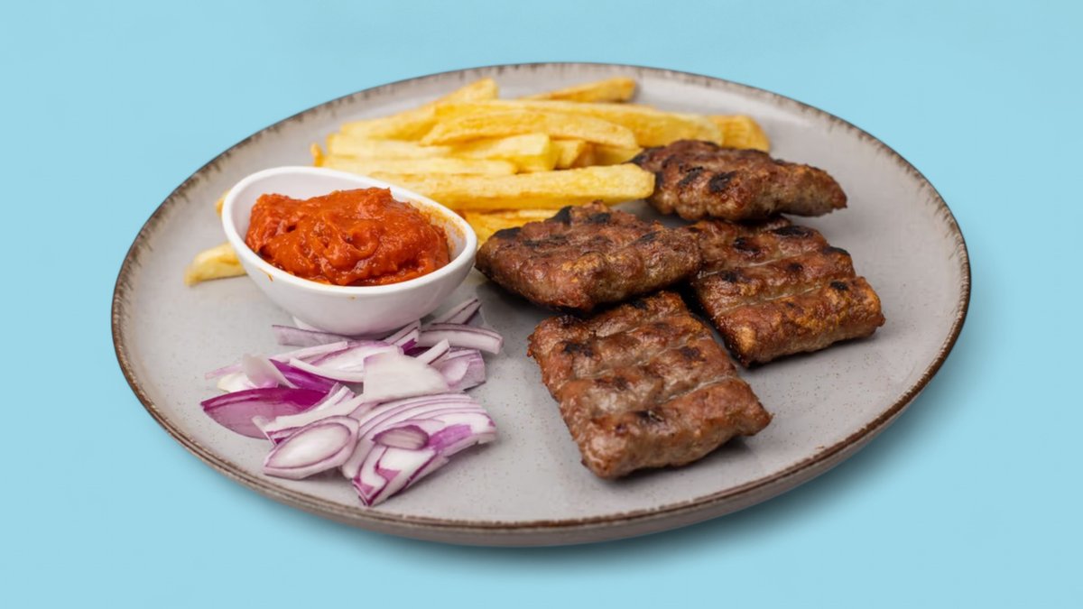 с гарнитура пържени картофки, лютеница и червен лук, 350г