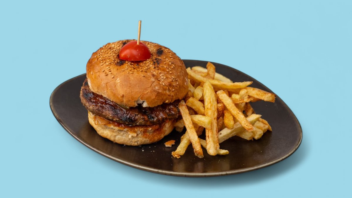 телешки бургер от Блек Ангъс, питка, сотирани зелени и червени чушки, лук и пресен домат, 400г