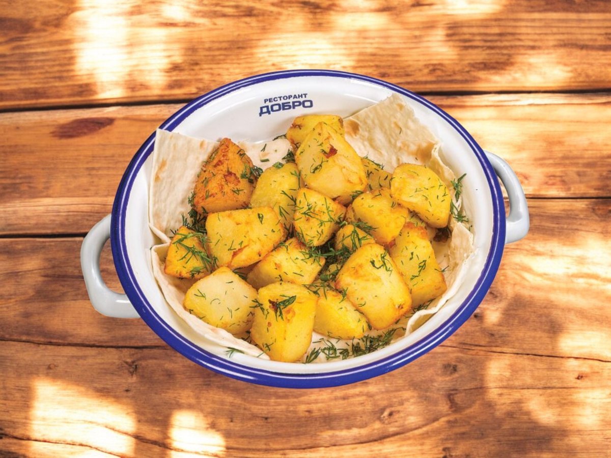 сварени картофи, сотирани до златисто в тиган с масло, чесън и копър 180г