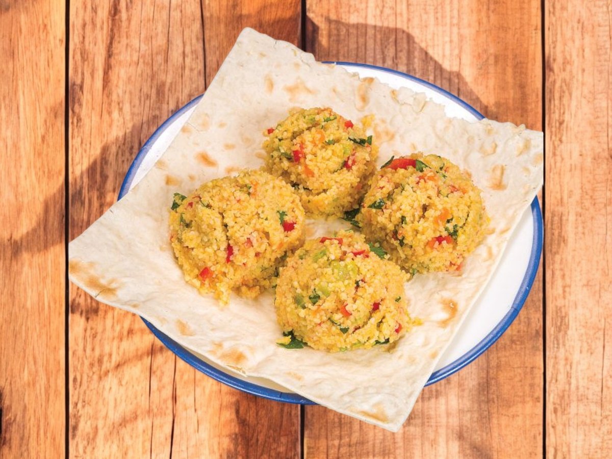 изключителни кюфтенца от добре узряло телешко месо и подправки с гарнитура сотирани зеленчуци с булгур и маринован лук 200г