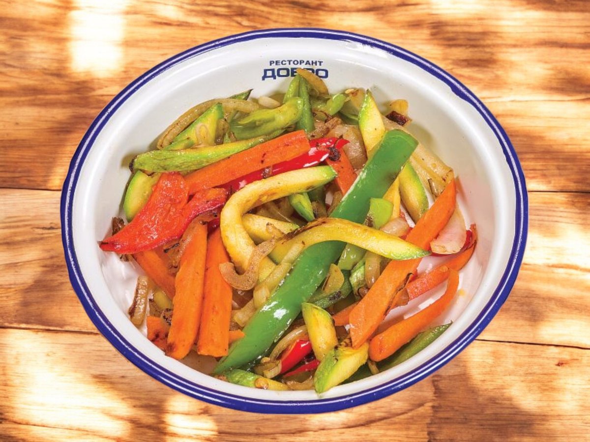 свежи моркови, почистени от семките тиквички, пресни зелени и червени чушки и лук, сотирани перфектно 150г