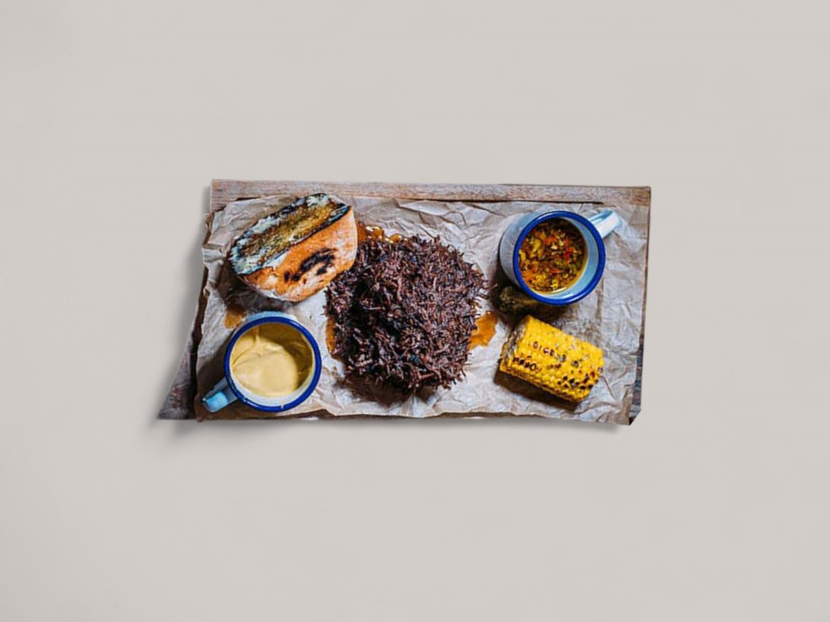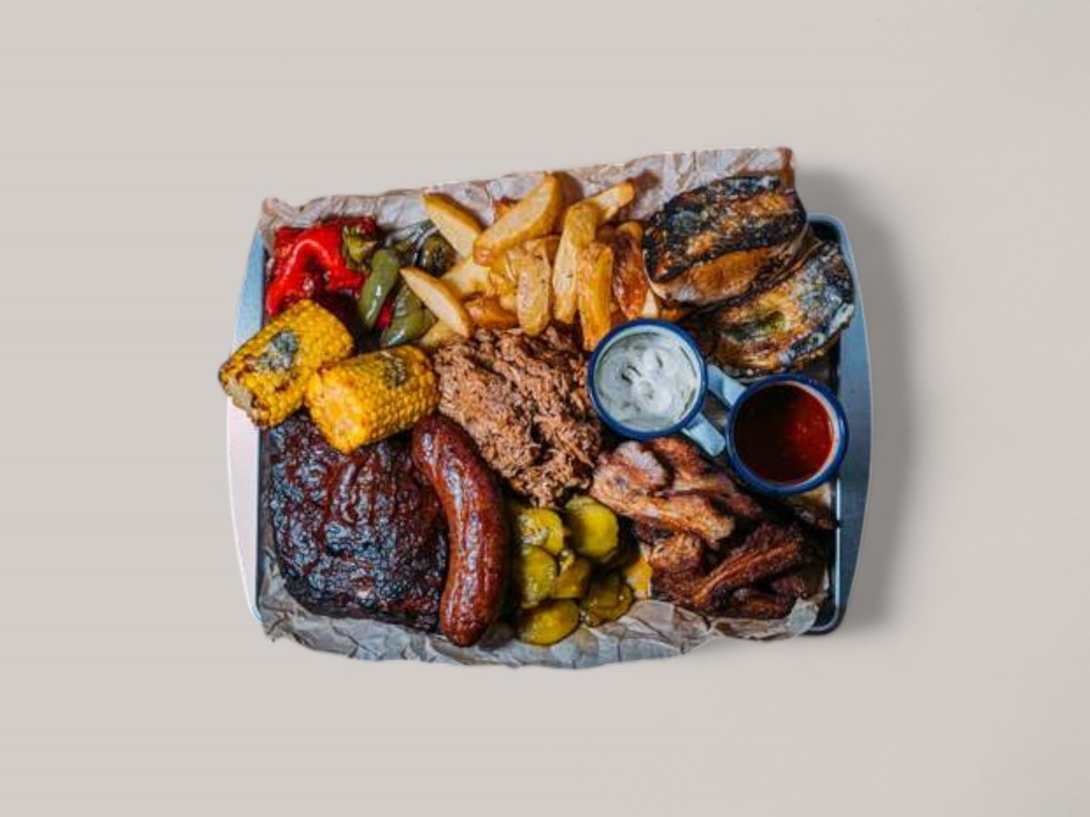 Свински ребра със сос от сливи, дърпано свинско месо, опушени свински гърди, пикантна опушена наденица, печена царевица, домашно пържени картофи, маринована червена чушка, кисели краставици, люти чушки, хляб с билково масло, майонеза с розмарин и ананасово bbq 1650г