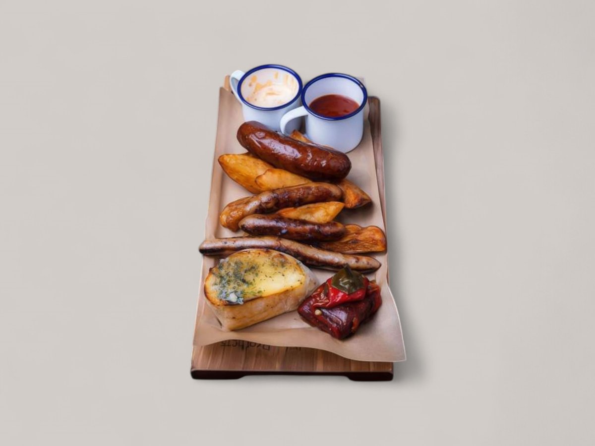 Опушен суджук, свинска наденица с праз и 2 микс наденици, пържени картофи, лимонена майонеза, ананасово bbq, маринована червена чушка и хляб с билково масло 550г