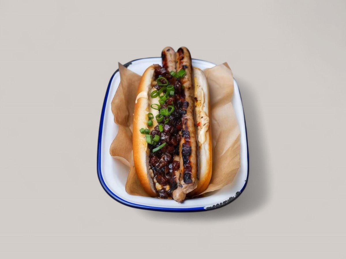 Хот дог хлебче с 2 х свинска наденица с праз, лимонена майонеза, пресен лук и мармалад от бекон, халапеньо и кафе 270г