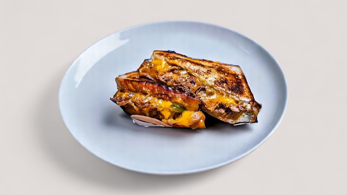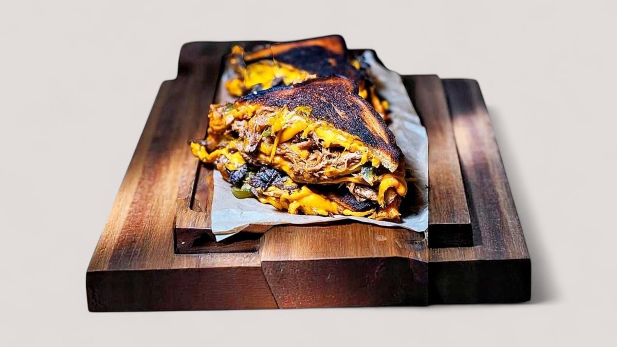 Грилован сандвич с дърпано говеждо месо, разтопен чедър, халапеньо, майонеза с розмарин 400г