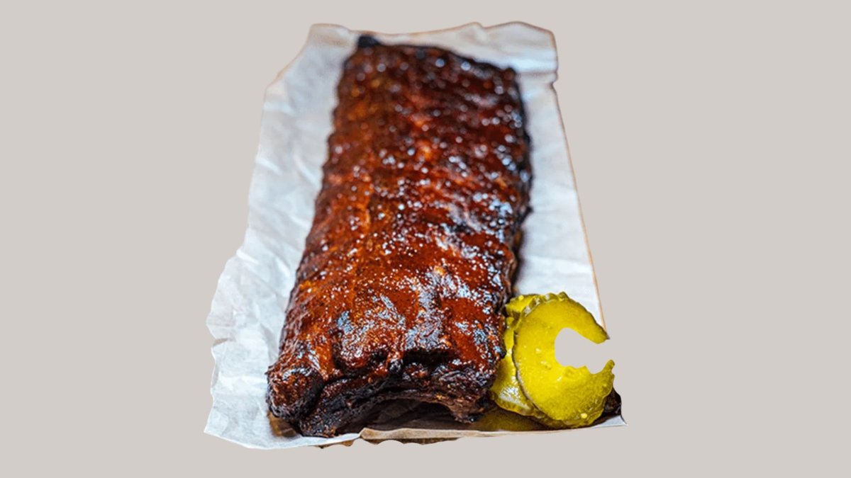 Свински ребра овкусени с домашен микс от подправки, глазирани с домашен ябълков BBQ сос и домашни мариновани кисели краставички