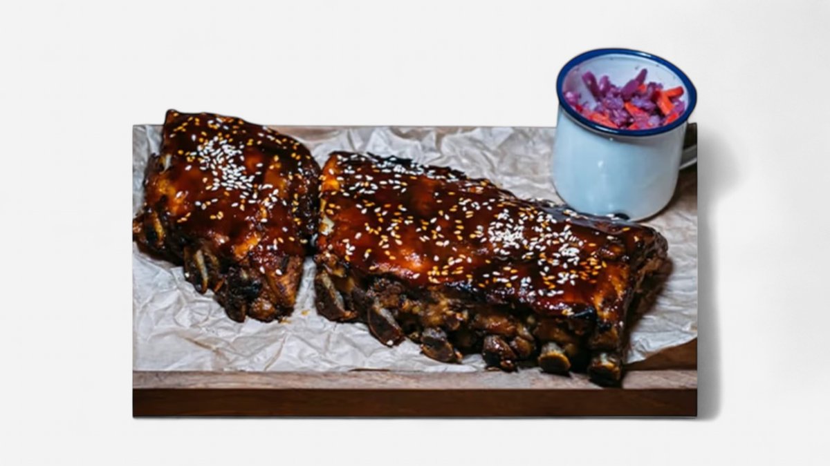Свински ребра овкусени с домашен микс от подправки, глазирани с корейски солено-сладък сос и колсло от маринован джинджифил и китайско зеле