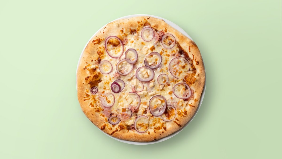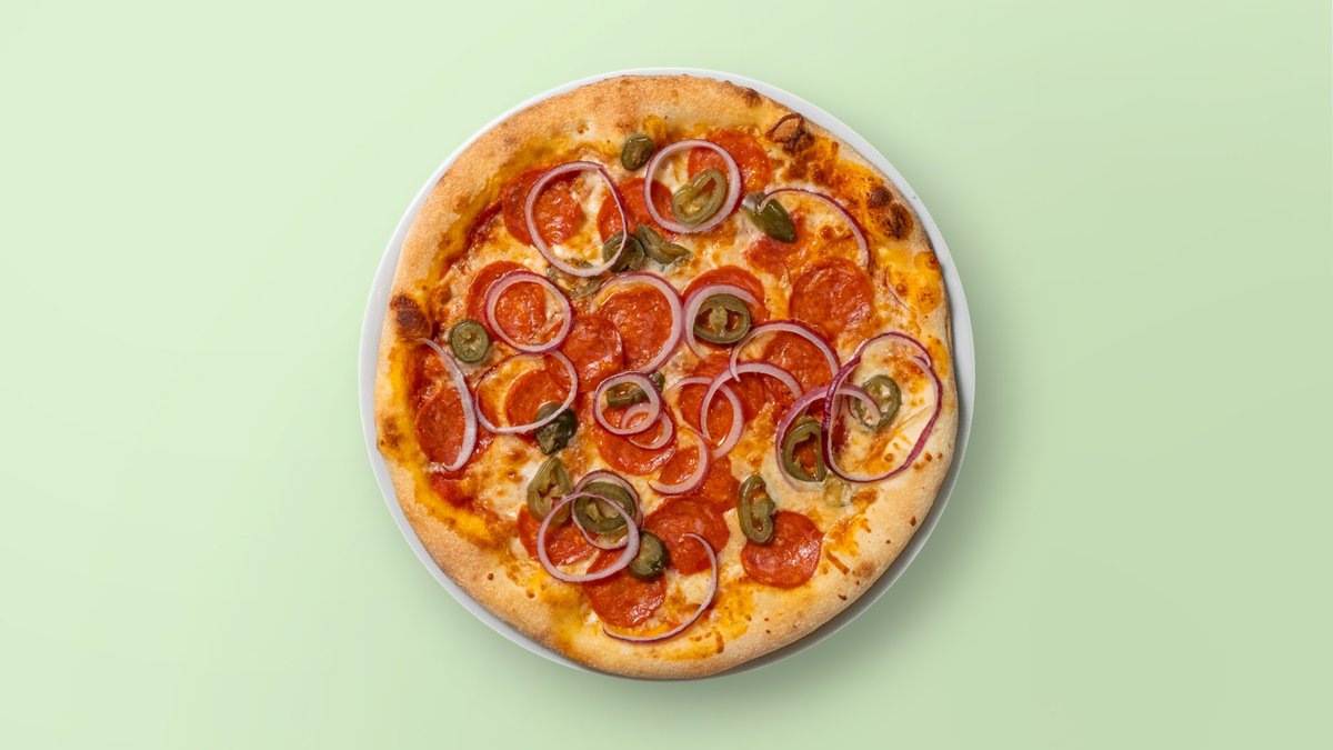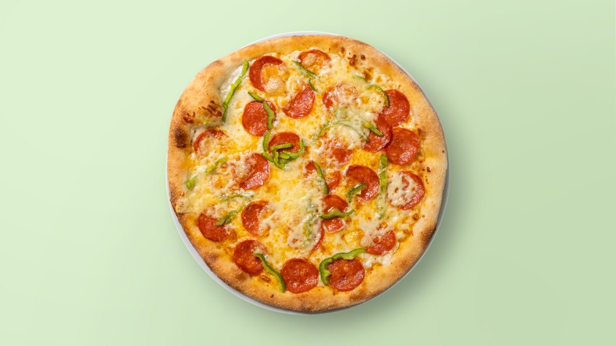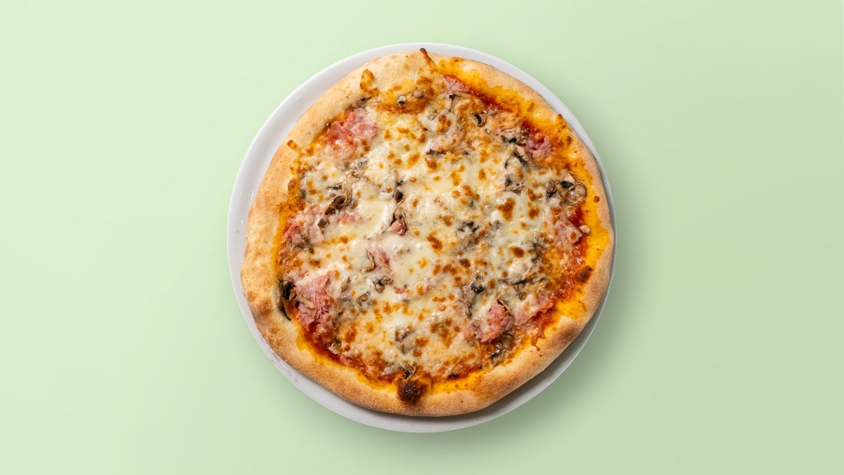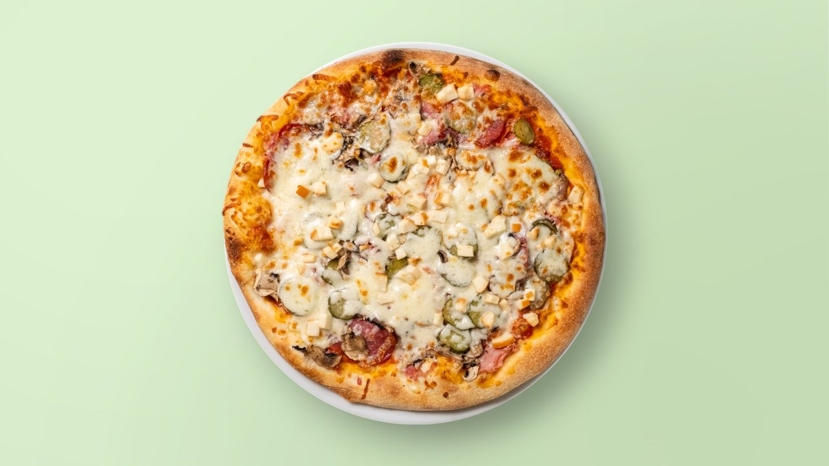 С шунка, луканка, пушено сирене, кисели краставички, гъби, доматен сос, моцарела 550г