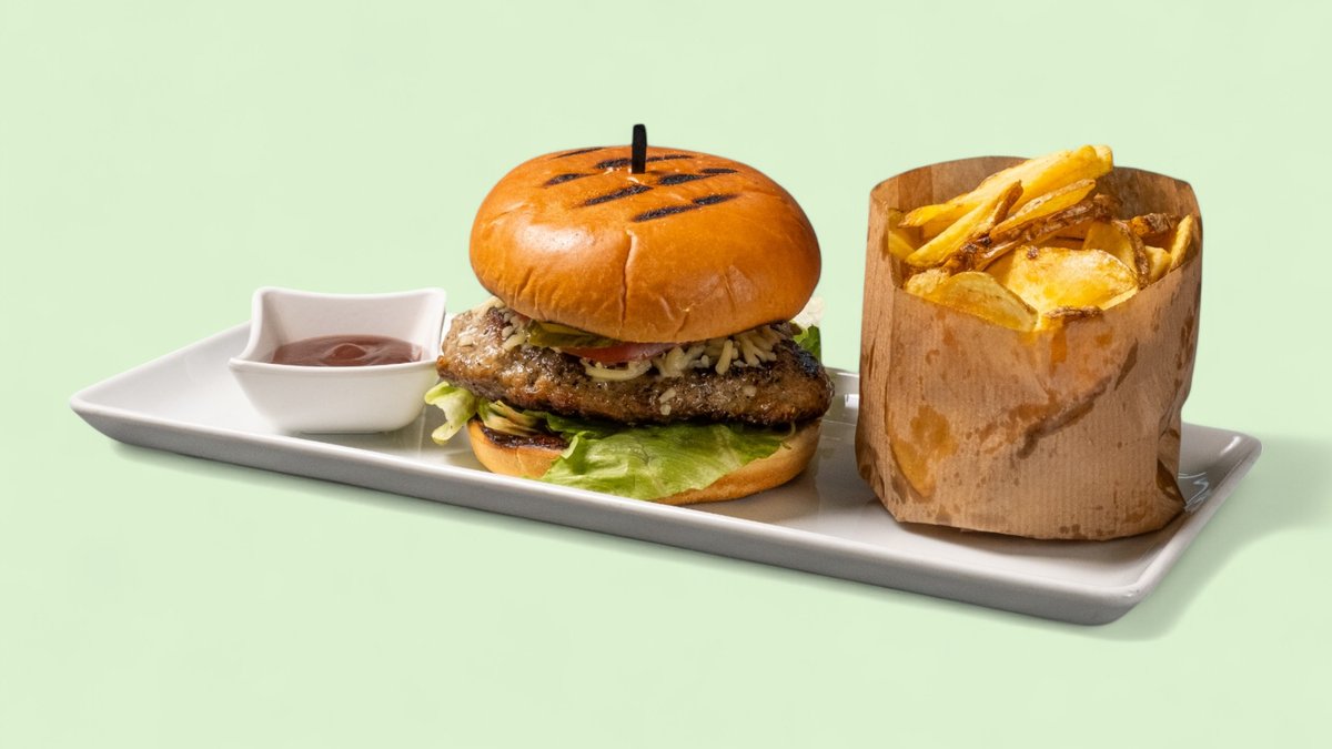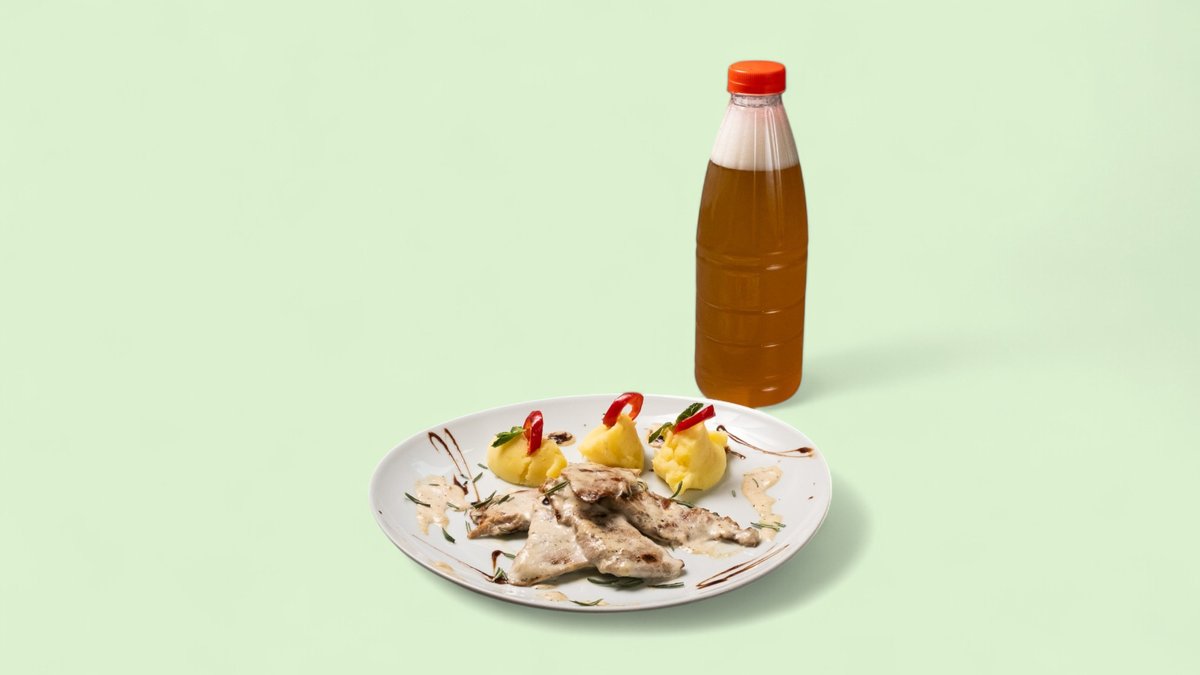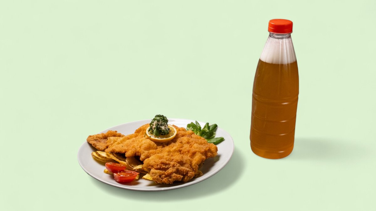 По класическа рецепта, гарниран с пържени картофки и билково масло и българска крафт бира без стабилизатори и консерванти, с неповторим свеж вкус на малц и хмел