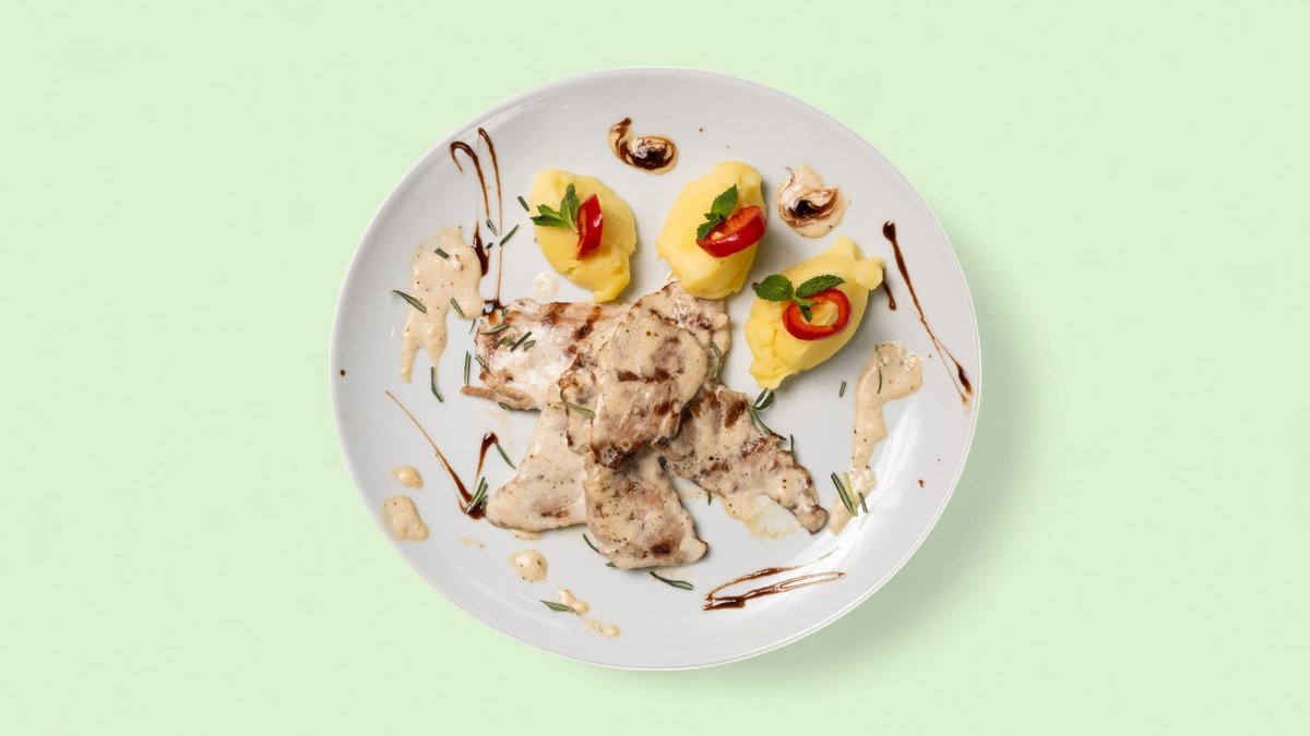 Пилешка пържола от бут, залята с горчичен сос и гарнирана с картофено пюре 400г