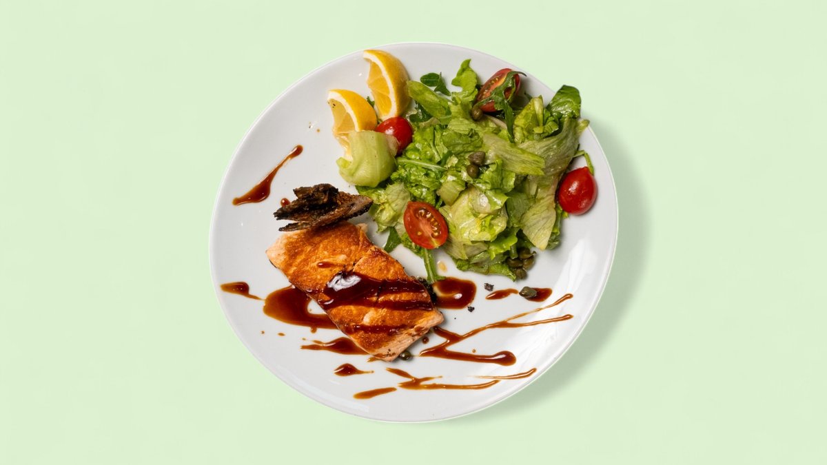 Филе от сьомга приготвено със сос терияки и гарнирано с микс от свежи салатки 250г