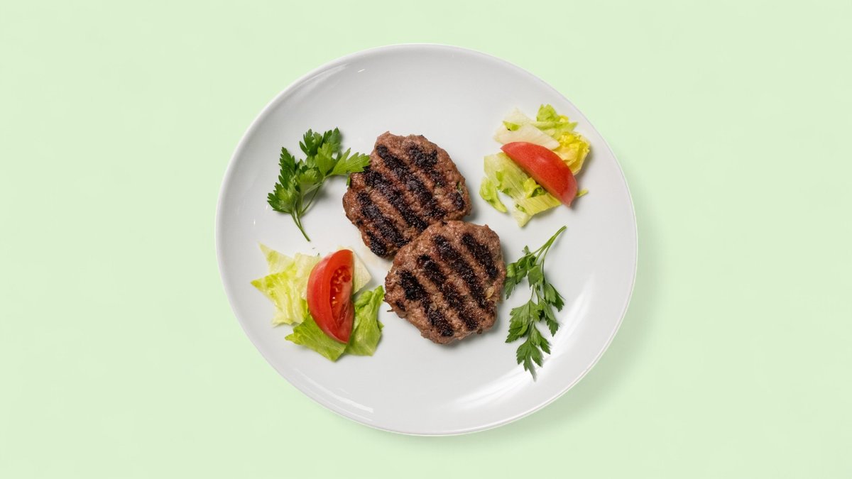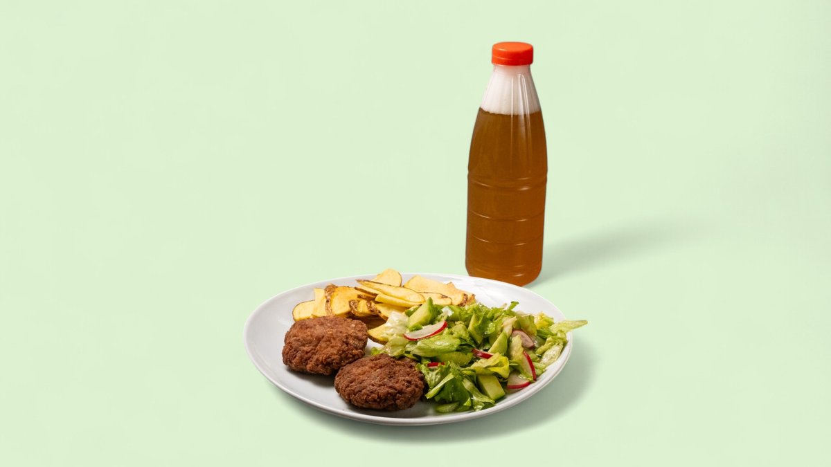 Пържени кюфтета от телешко месо с картофи и зелена салата+жива бира