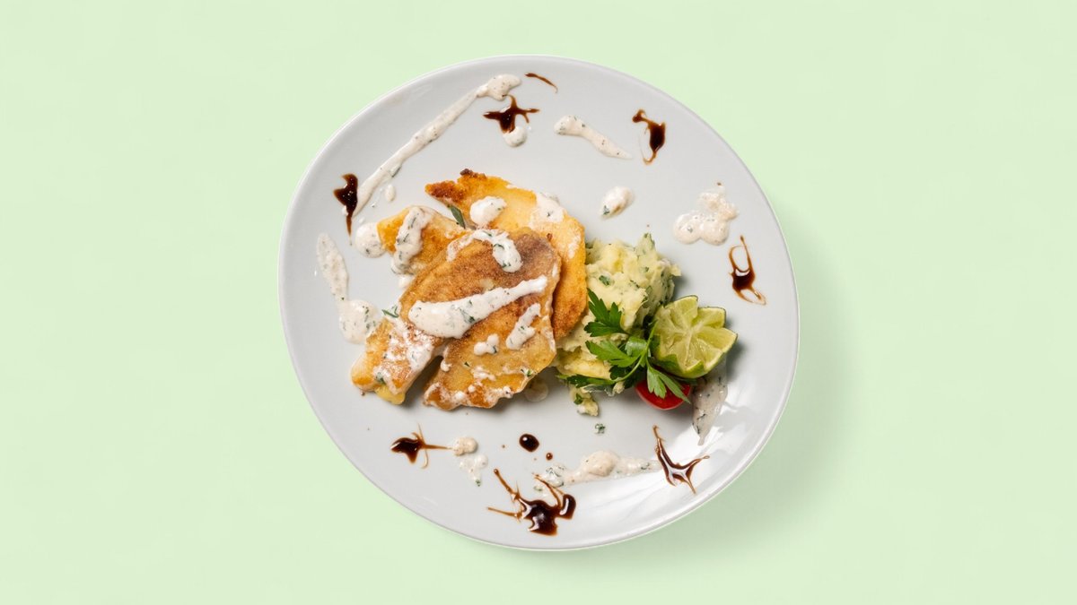Запържена до златисто, поднесена със сметана, магданоз и картофено пюре 400г