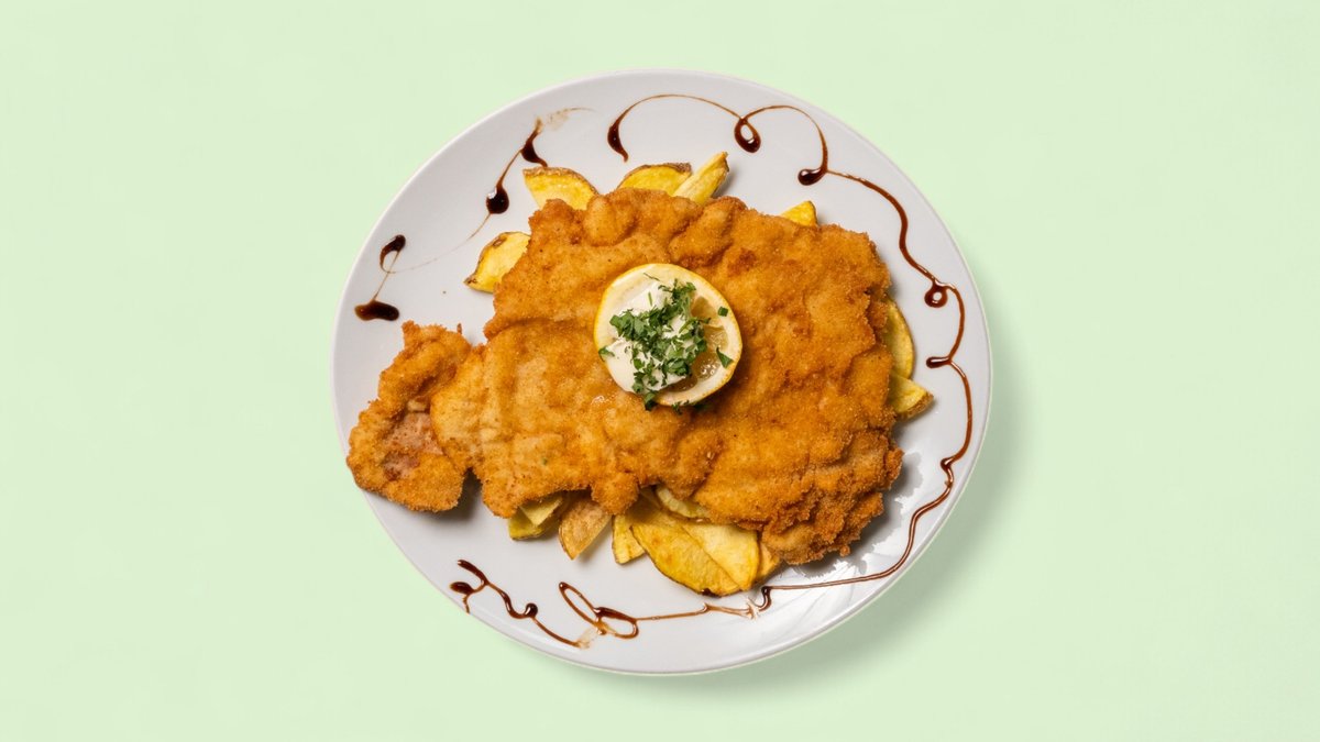 По класическа рецепта, гарниран с пържени картофки и билково масло 350г