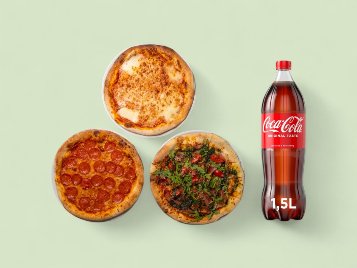 Изберете три (30 см) пици от нашето меню, замесени по италианска рецепта с висококачествени продукти и на страхотна цена и Кока кола напитка 1,5л.