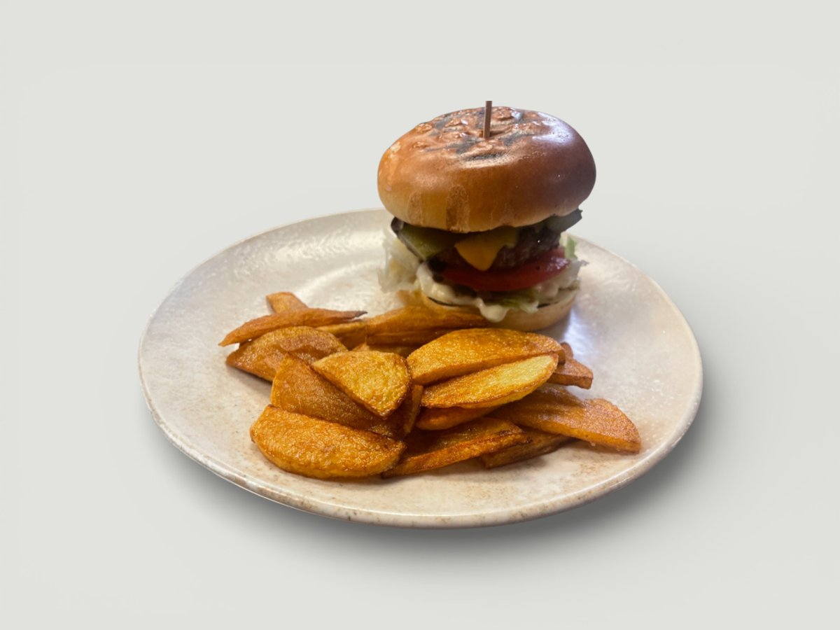 Телешки чийзбургер с пържени картофи
