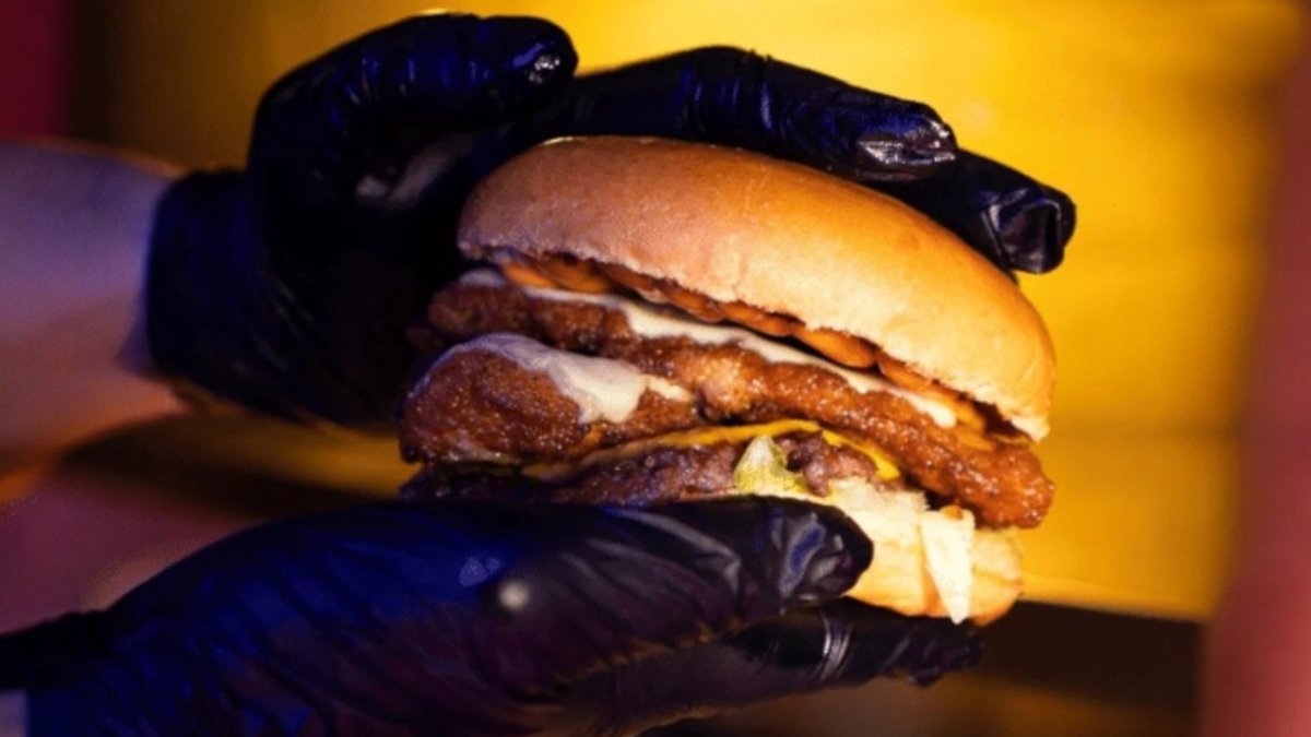 хрупкаво пилешко филе, прясно телешко, чедър слайс, разтопена френска моцарела, лук, айсберг, кисели краставички, микс от коктейл и специалното сосче, 380г