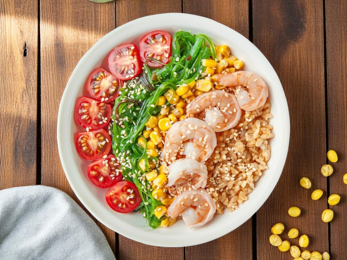 ориз, тигрови скариди, чери домати, сусам, консервирана царевица, уакаме 350г