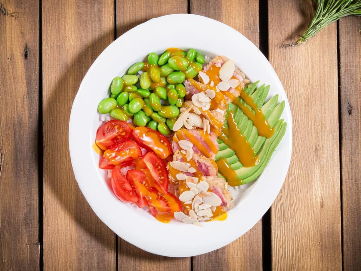 боул с ориз, риба тон темпура, авокадо, чери домати, едамаме, филирани бадеми и сос от манго, 50г домашно приготвен сос 320г